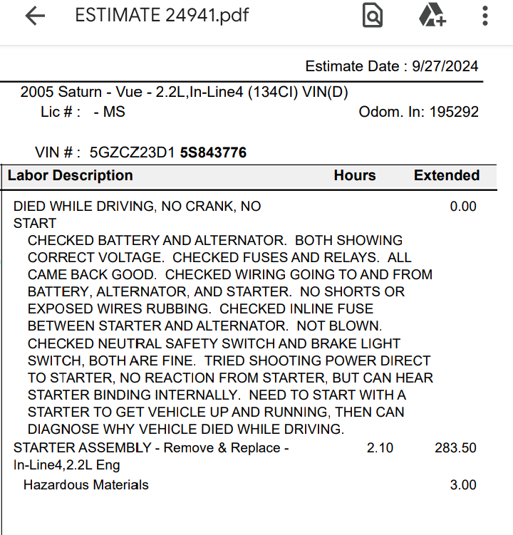 Need help with a 05 4 cylinder Vue (all the miles, I know it's high but it's not here to get mileage)Backstory: been having issues with my alternator/battery and ended up having it replaced 2 times in the last two weeks since the first one they installed was faulty. (Shouldn't they test that before installing!?) As soon as I picked the car up I noticed it was running rough but figured it was bad gas and added some gas dry, I literally drove straight home with just a few miles so no big deal.Went to town the next morning, it started stalling at stop signs and I rather annoyed figured I would swing back by the mechanic after class.The stalling got worse to were it was any time I wasn't rolling, at the point I was simply trying to get back to the mechanic but it finally died at the last stop sign and simply refused to restart.