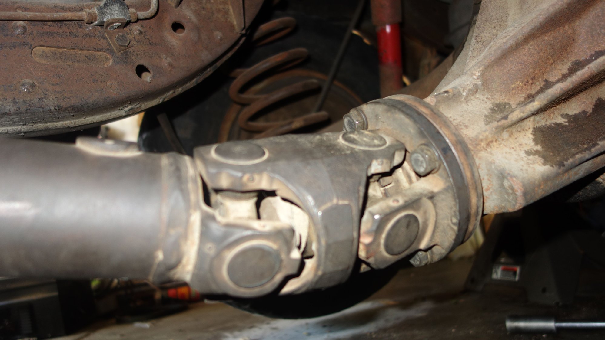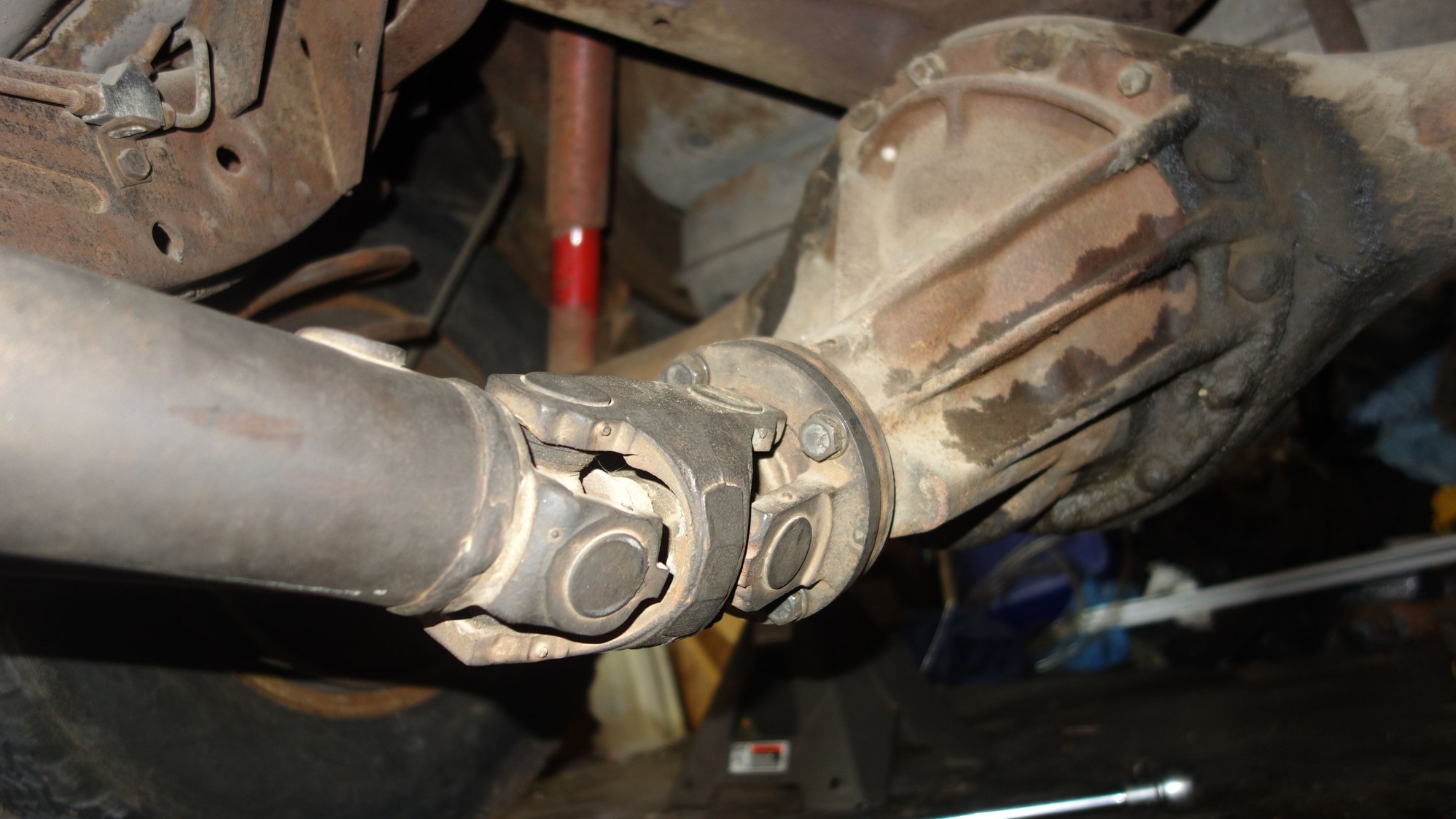 My first classic car, a 1964 cadillac sedan deville, with 427 V8, turbo hydra-matic transmission that takes only 2 quarts of ATF, original green paint and white top (rough condition, but may be saveable), a fully intact interior except the worn front seat, and a driveshaft that was disconnected 40 years ago before it was left in a barn, and could not be re-attached to the rear differential flange without dropping the axle, because what I assume is a rear slip-yoke is stuck in its fully extended position. The driveshaft is in 2 sections with a normal U-joint in the front, and Double U-joints in the middle, just after the frame-mounted center bearing, and the back. In the middle of the rear section, a a smaller tube goes into the larger tube, sealed with what looks like a rubber gasket. I think that it might break lose when I lower the car (axel re-installed), but am worried about what else might break in the process... Will lowering the car with the driveshaft connected break anything?