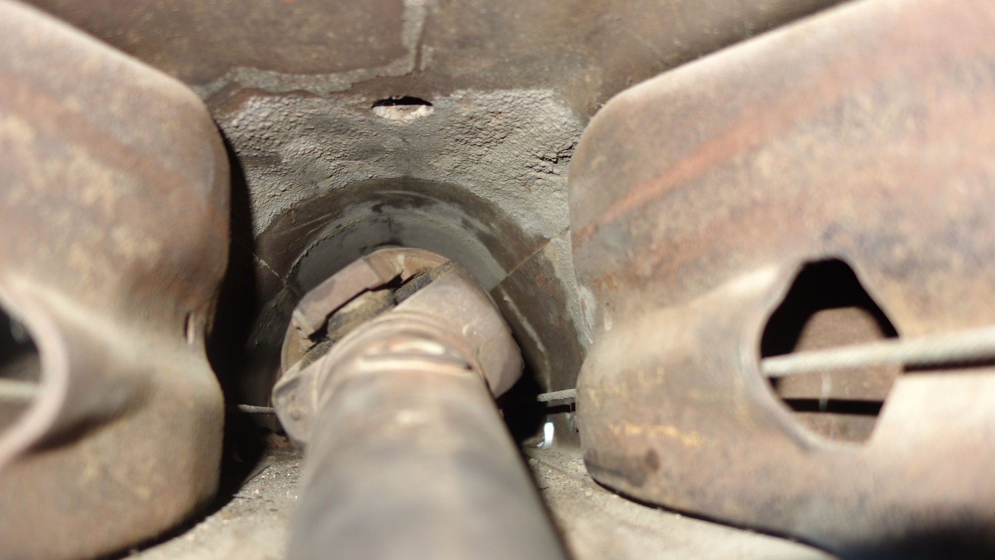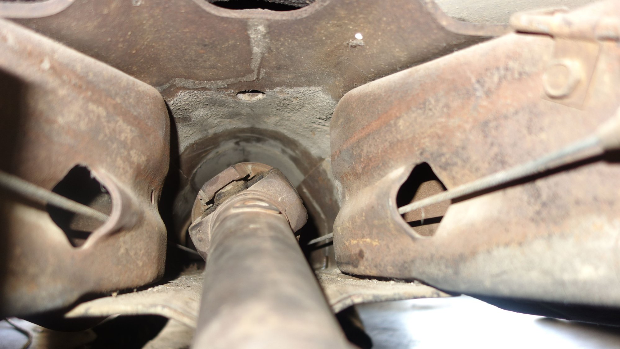 I did manage to get the drive shaft in (I think)... by completely removing the rear axel. In the process, one of the brake hoses snapped, Well.. I should flush the brakes anyway... The shop manual only says it takes "SAE approved heavy-duty brake fluid", so is it DOT 3, or 4? The world may never know...