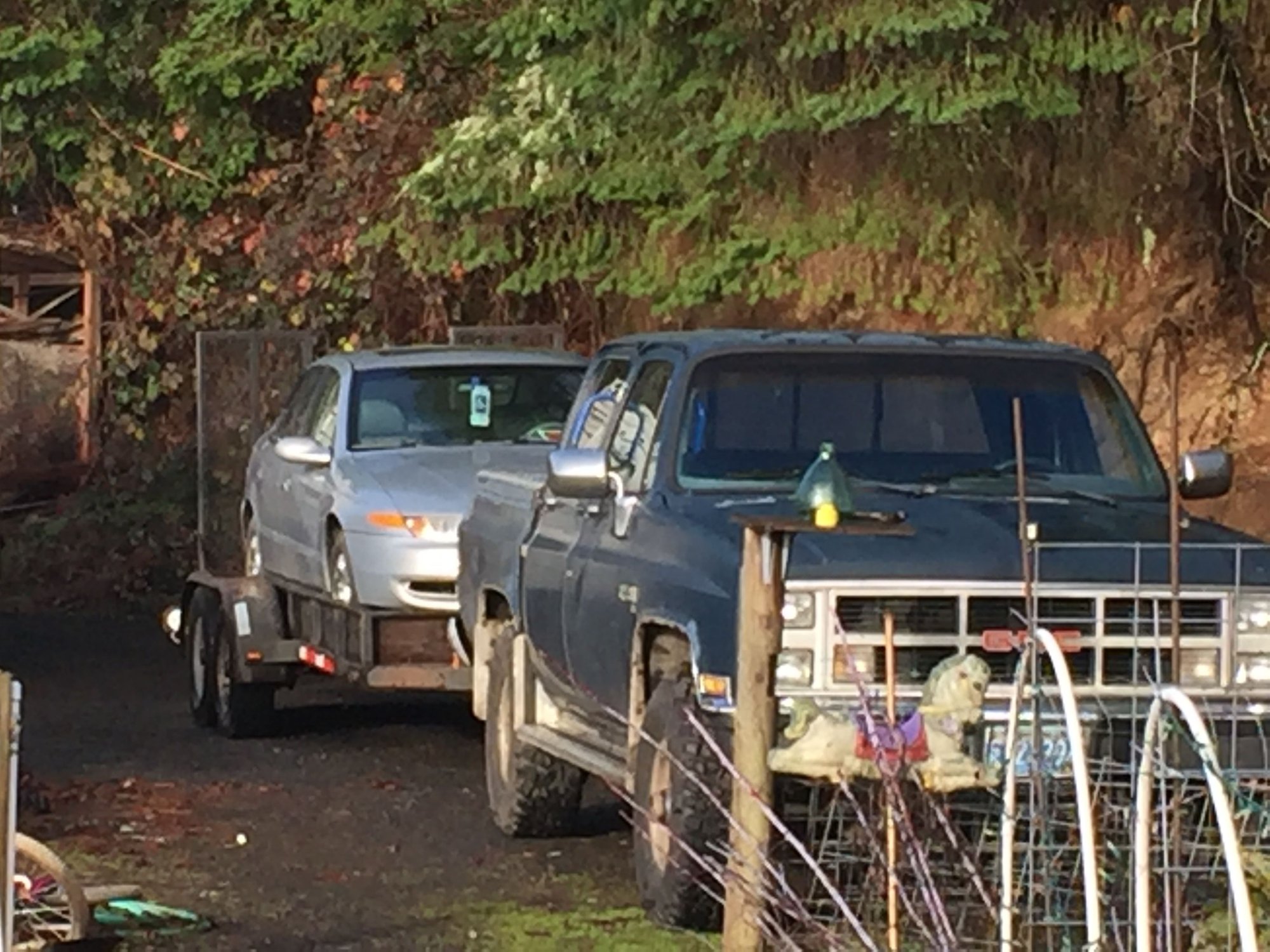 My trailer has a raised rail around three sides so I filled the car before lowering it onto the trailer. Ready for the scrapyard, title in hand!