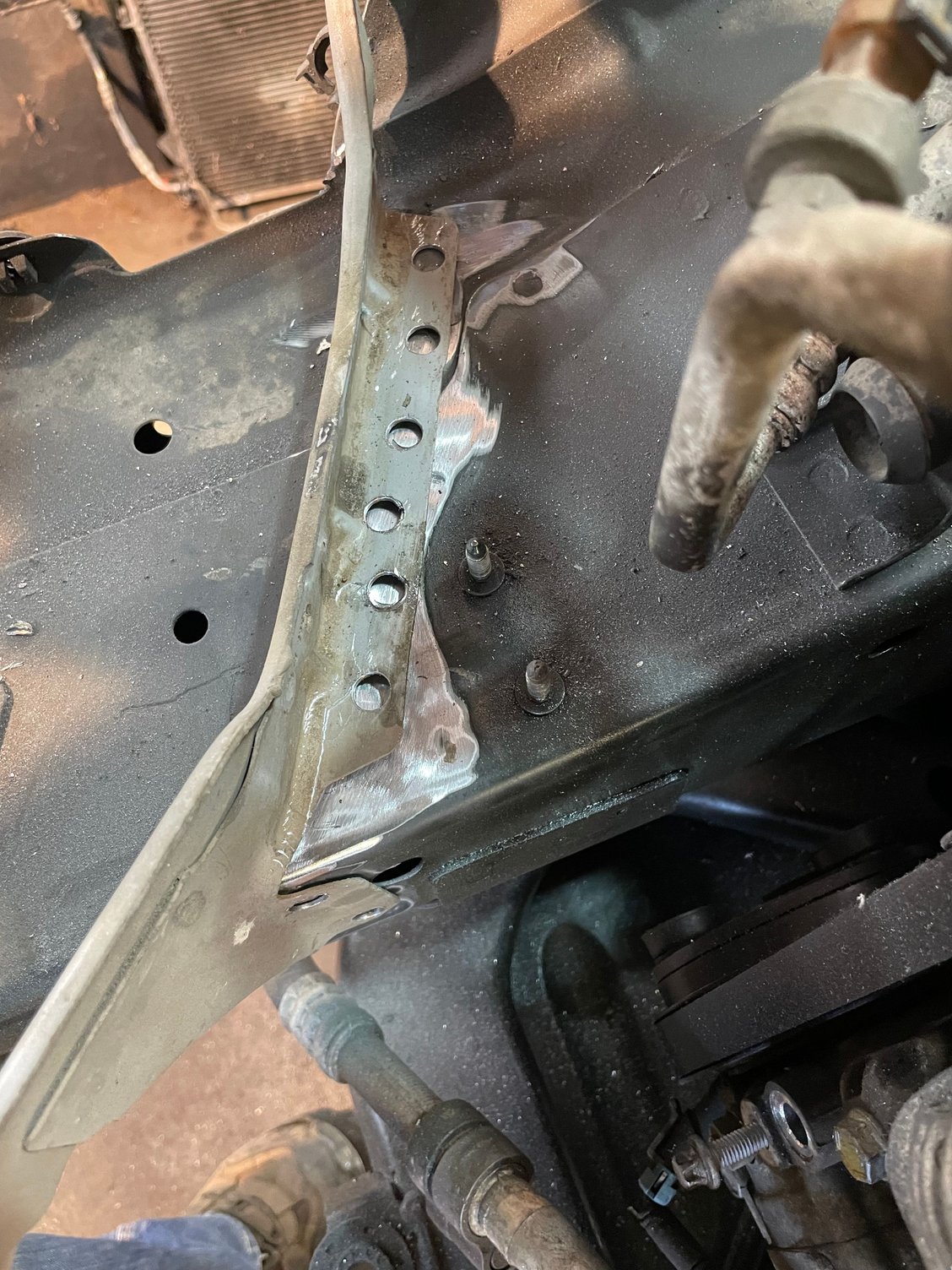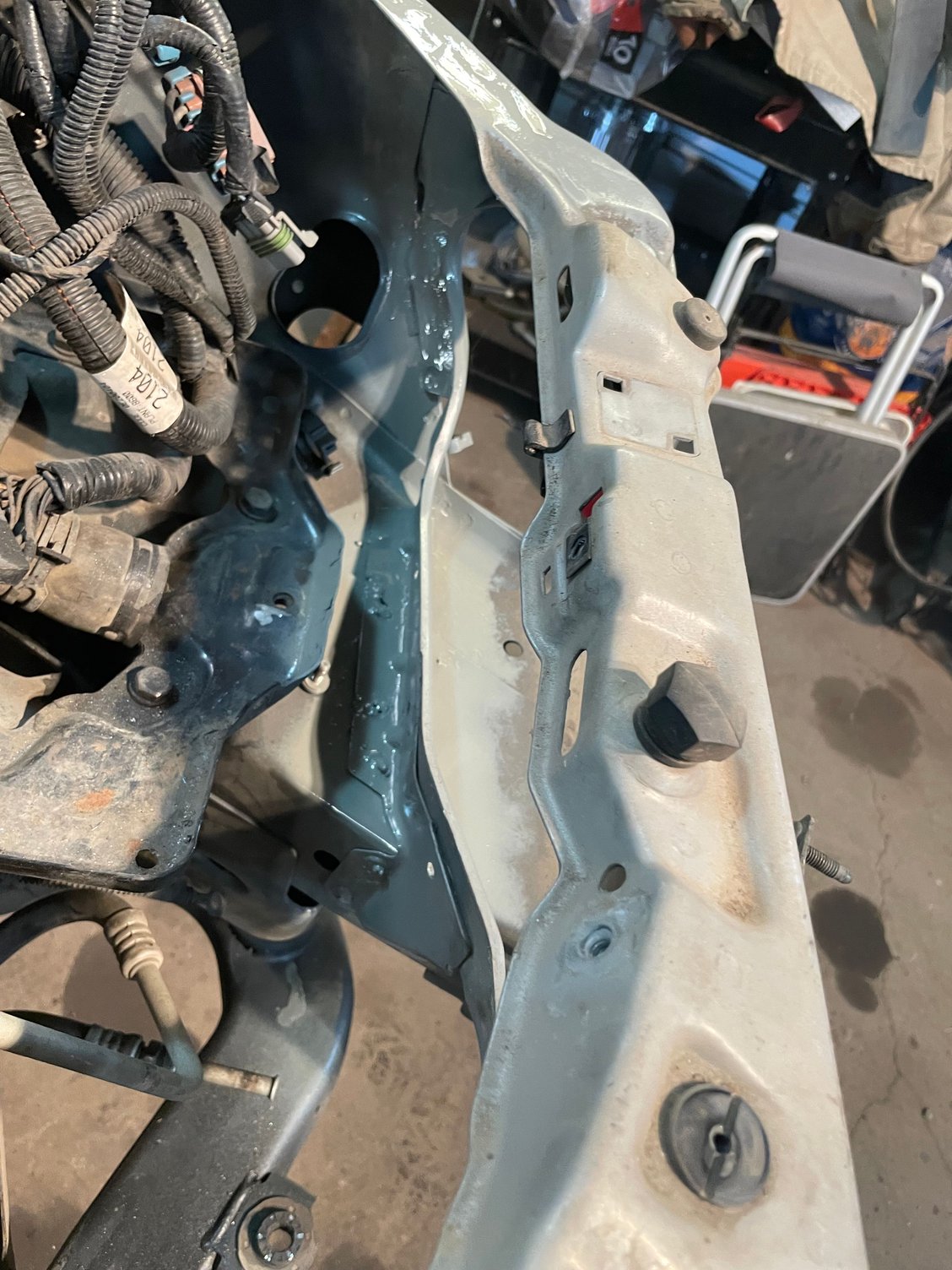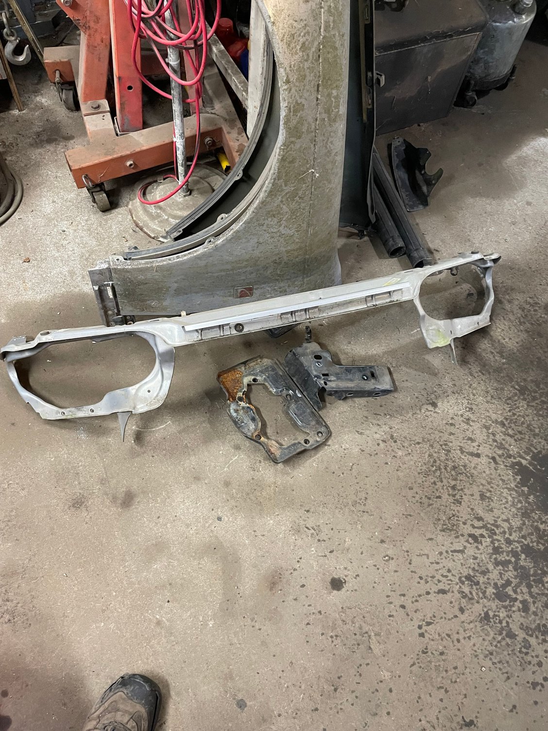 The bottom of the cooling group sits on the subframe on this series of cars. The top of the cooling group attaches to the rear of the upper core support. The cooling group is still intact and will be reinstalled after the upper core support is welded back in, in the next couple days. Removal and cleanup tomorrow, no rush I am just realizing.