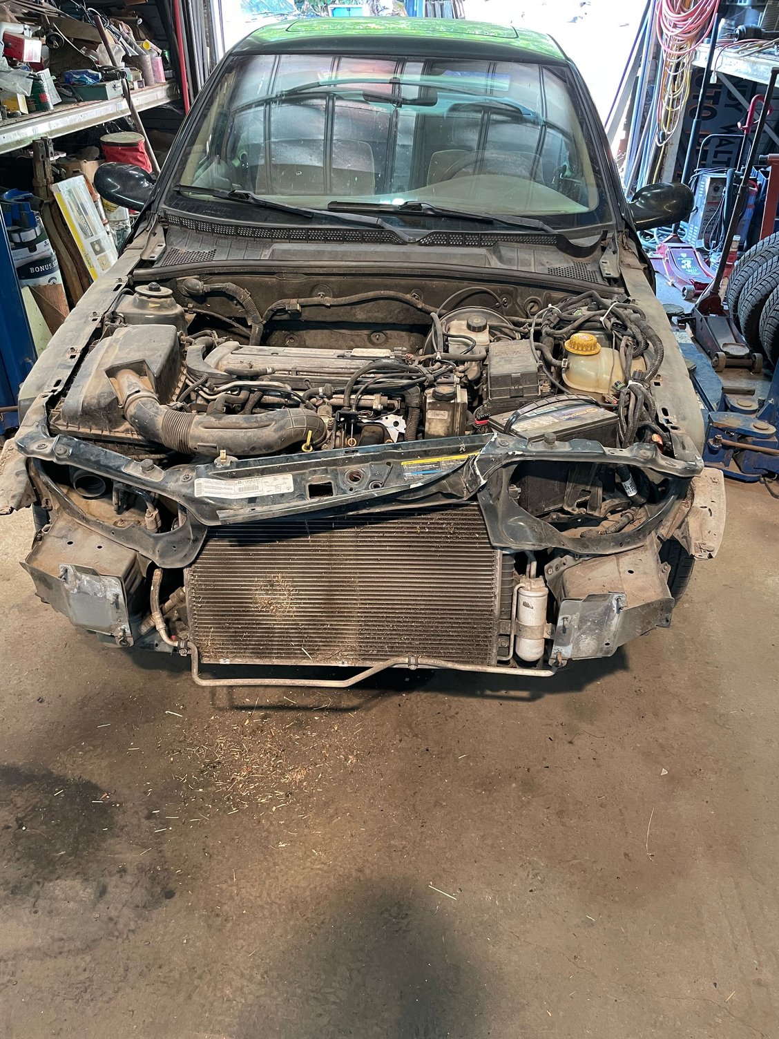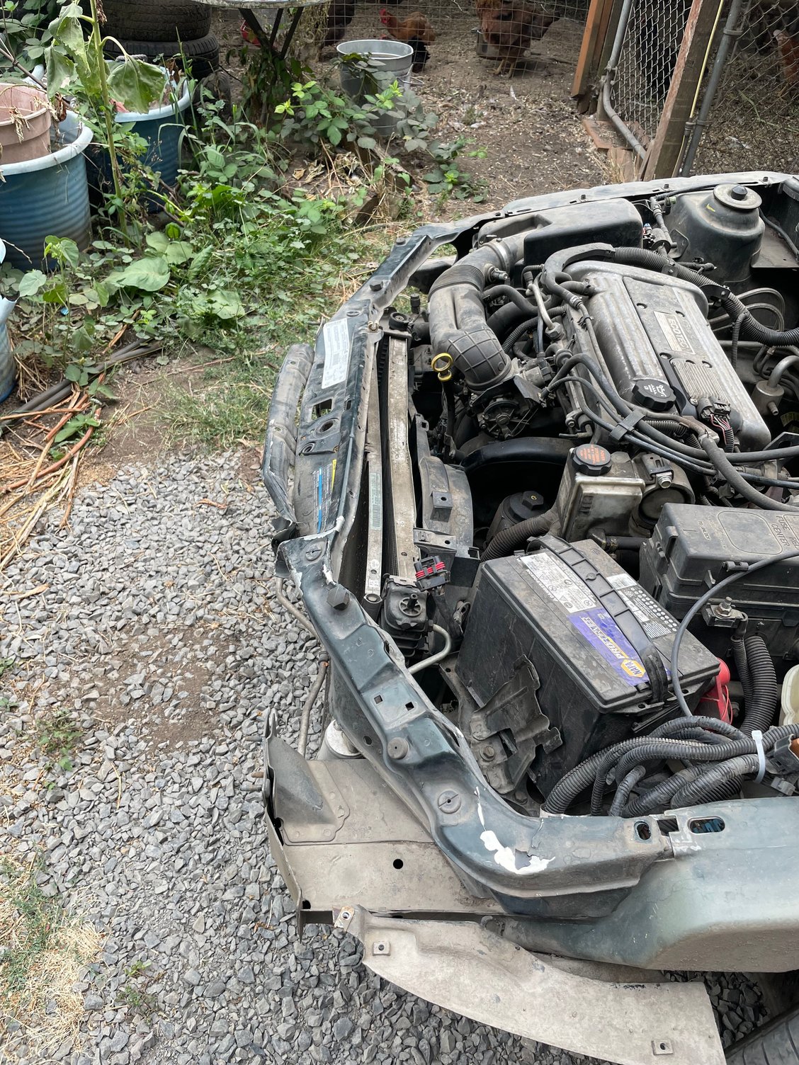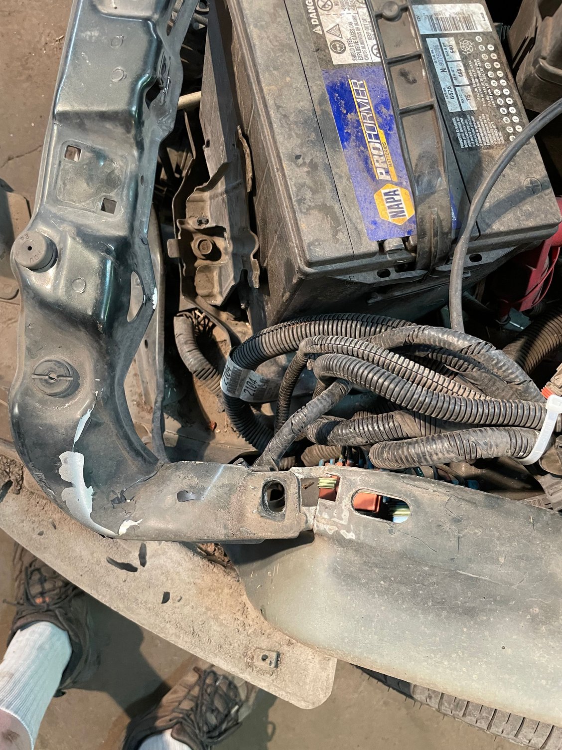 Big progress today, spent the morning removing the bent parts. Preparing to install the replacement upper core support, welder needed new tips. Trip to Harbor Freight. 😀