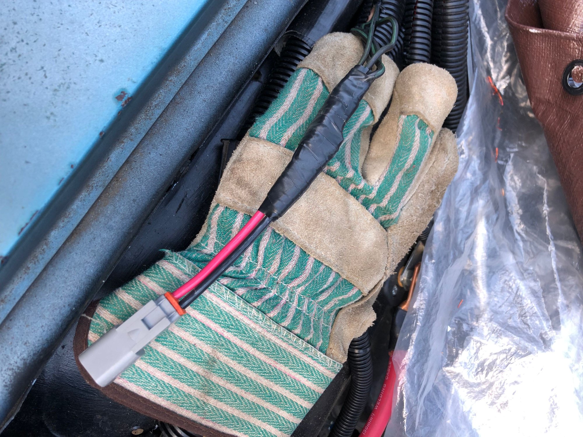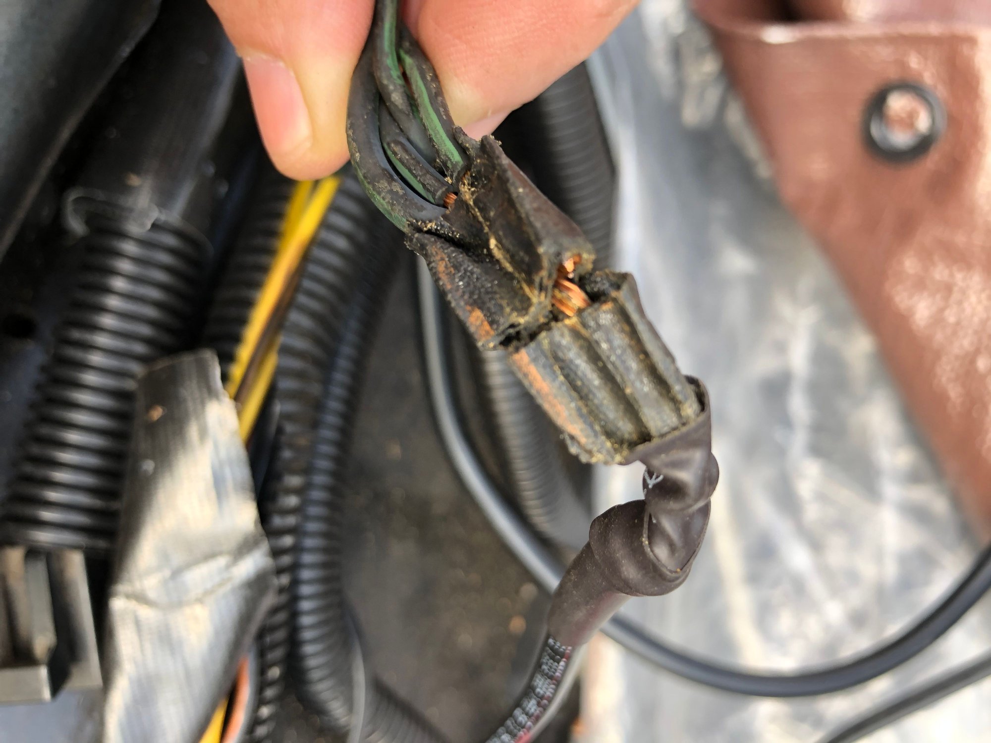 Since the weather was much better than forecasted; I decided to replace the ECM ground connector once again. This time I spliced further up the harness where the 5 ground wires merge into 1 wire. There was a mass of hardened duct or electrical tape covering the merge. I spent 20 minutes cutting and breaking that tape apart. I found that somebody (Ford or some mechanic?) crimped that all into one 14AWG wire. Before I did this, I noted that is where the wire was bent and fairly flexible. In any event, I removed the single-pin Deutsch connector and put the 2-pin Deutsch connector back in its place. I spliced 3 of the ground wires to one pin; and the other 2 ground wires to the other pin. Everything seems to be solid. I don't think this was the problem; but I feel better having done that. I was going to test it out; but I decided to get the battery charger and cover the CV back up along with the charger; and let it slowly charge overnight.