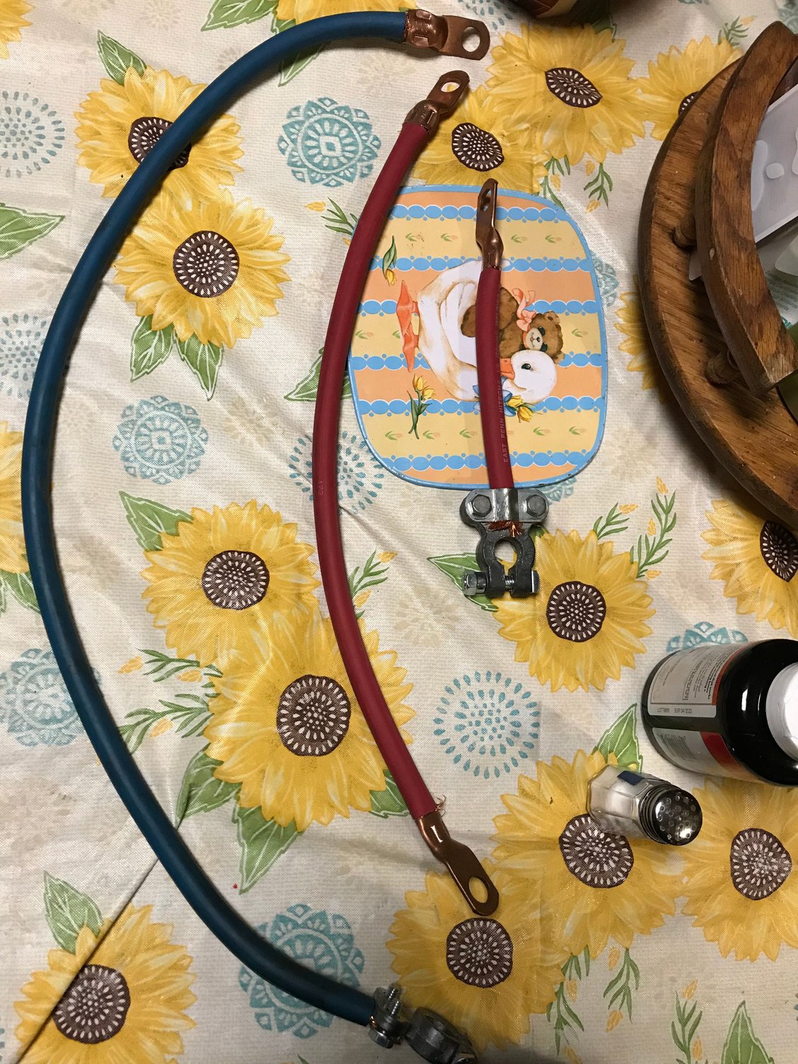 I found the battery for the Crown Vic on Saturday. I was rummaging through the uncrushed portion of the garage and found it under the Lincoln SA-200. My Dad must have put it there along with the Ranger battery. So I took the CV battery and put it in the battery tray in order to measure, cut, and assemble the battery cables. And to run the power cable for the electric fan. In the pic below from right to left; battery + to starter relay; battery + to the power distribution block on the fender; and battery - to engine ground. I was sidelined by sinus issues yesterday; so I only managed to heat shrink the terminal ends on the battery cables. If I have time after work this week; I will start looking everything over and prep for the 1st start. And yes, I sometimes work off of the kitchen table