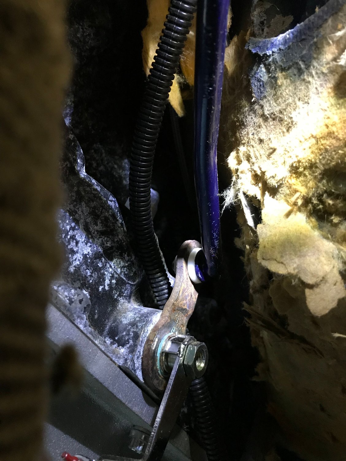 I had a light lunch and continued working on the CV. Put up the shift linkage since the header is down. Had to get the long pliers to force the rod into shift lever on the AOD. I may find the time this week to drain off the remaining WD-40 and start filling the engine with regular oil (and some Zinc additive). Still have to find a place on the engine for the battery ground; but that is pretty much it.