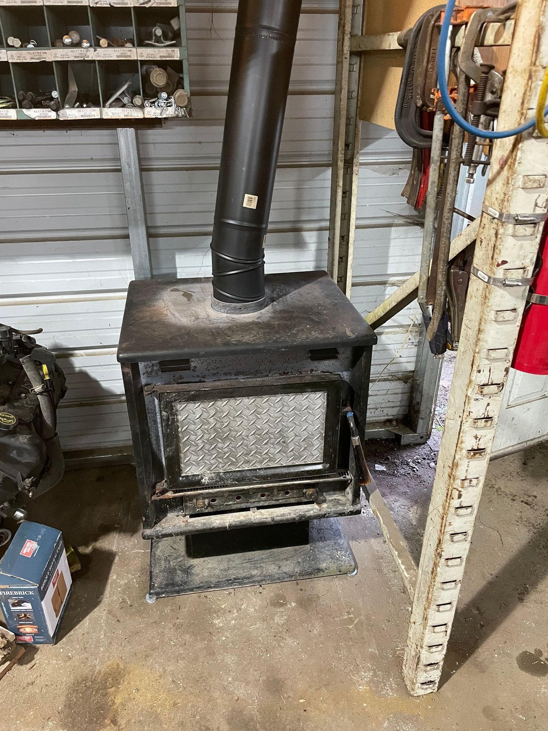 We moved a bunch of Navigator stuff around in the shop, loaded a top shelf with 03 stuff. Moved the 06 engine and installed a nice used wood stove, now there is heat in the shop. It has been in the low 30s for the last week overnights. Built our first fire and the shop heated up nicely. We even had snow this week on Wednesday, it is gone now. Back to the Chevy engine tomorrow. 😀