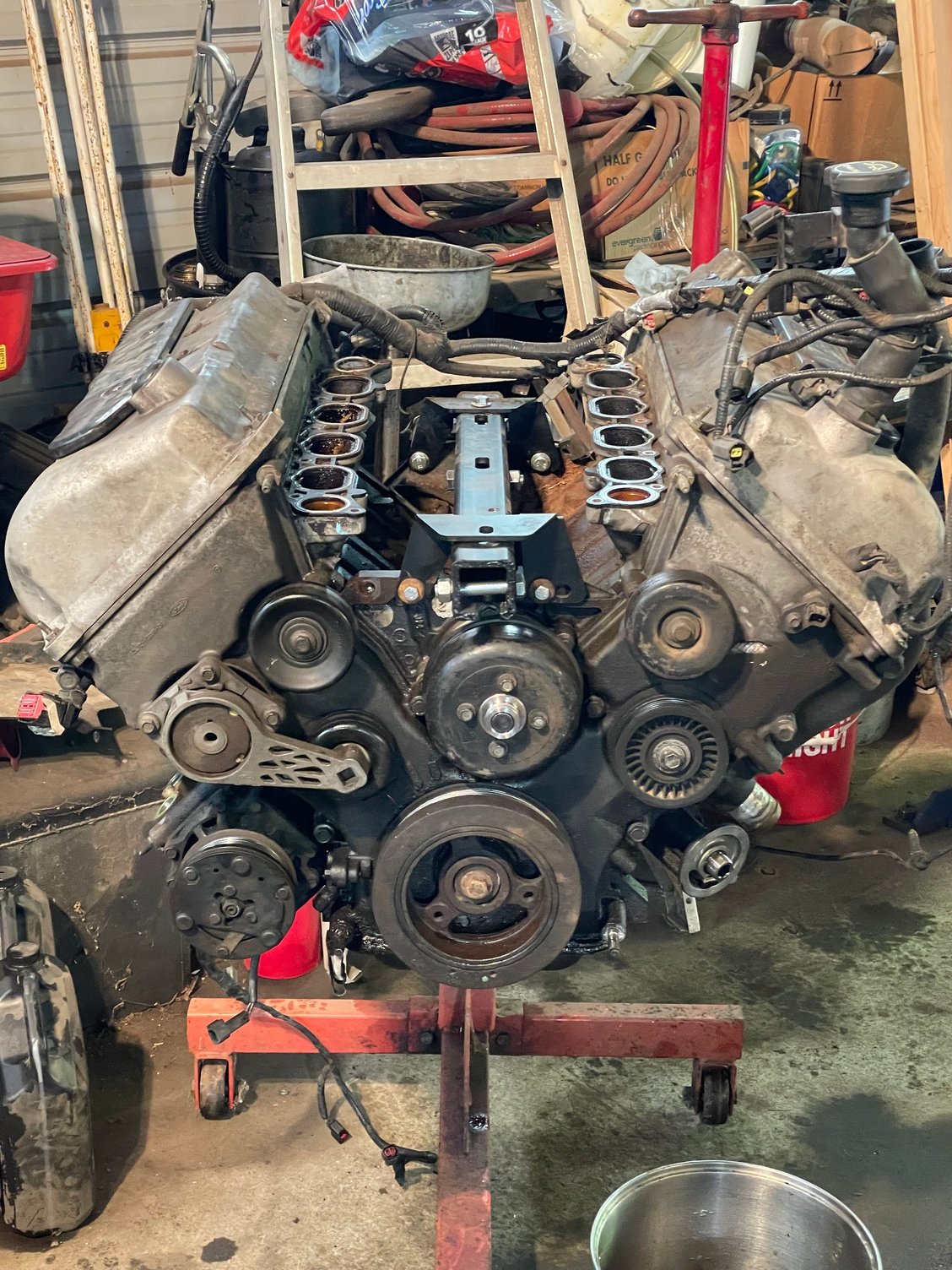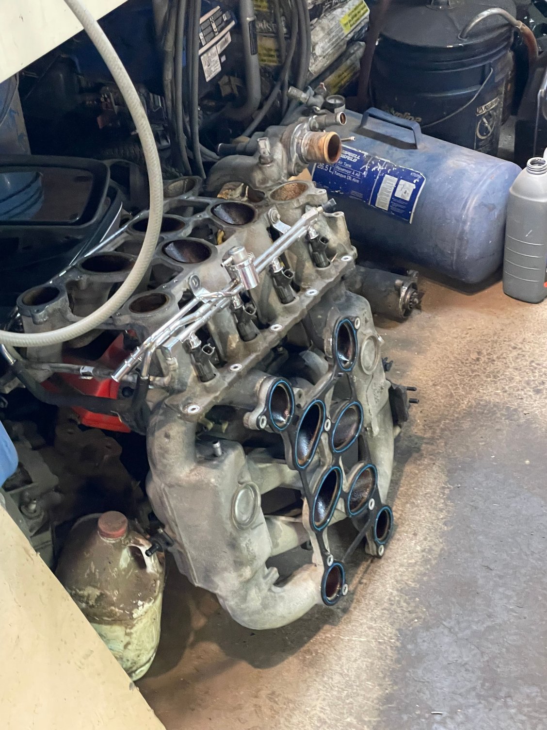 I am stripping the turd and I am now evaluating the engine before it goes in the gem. The engine is on a stand and the second picture is of the two piece intake manifold.