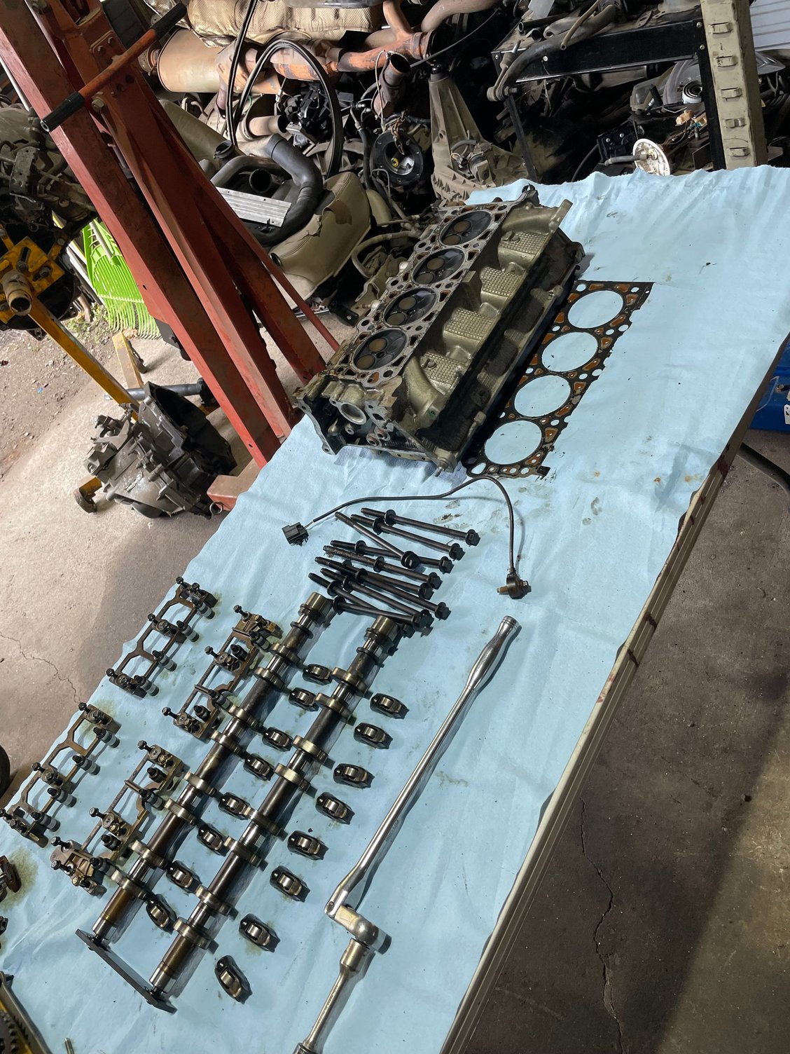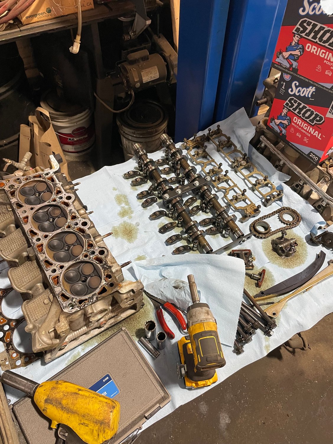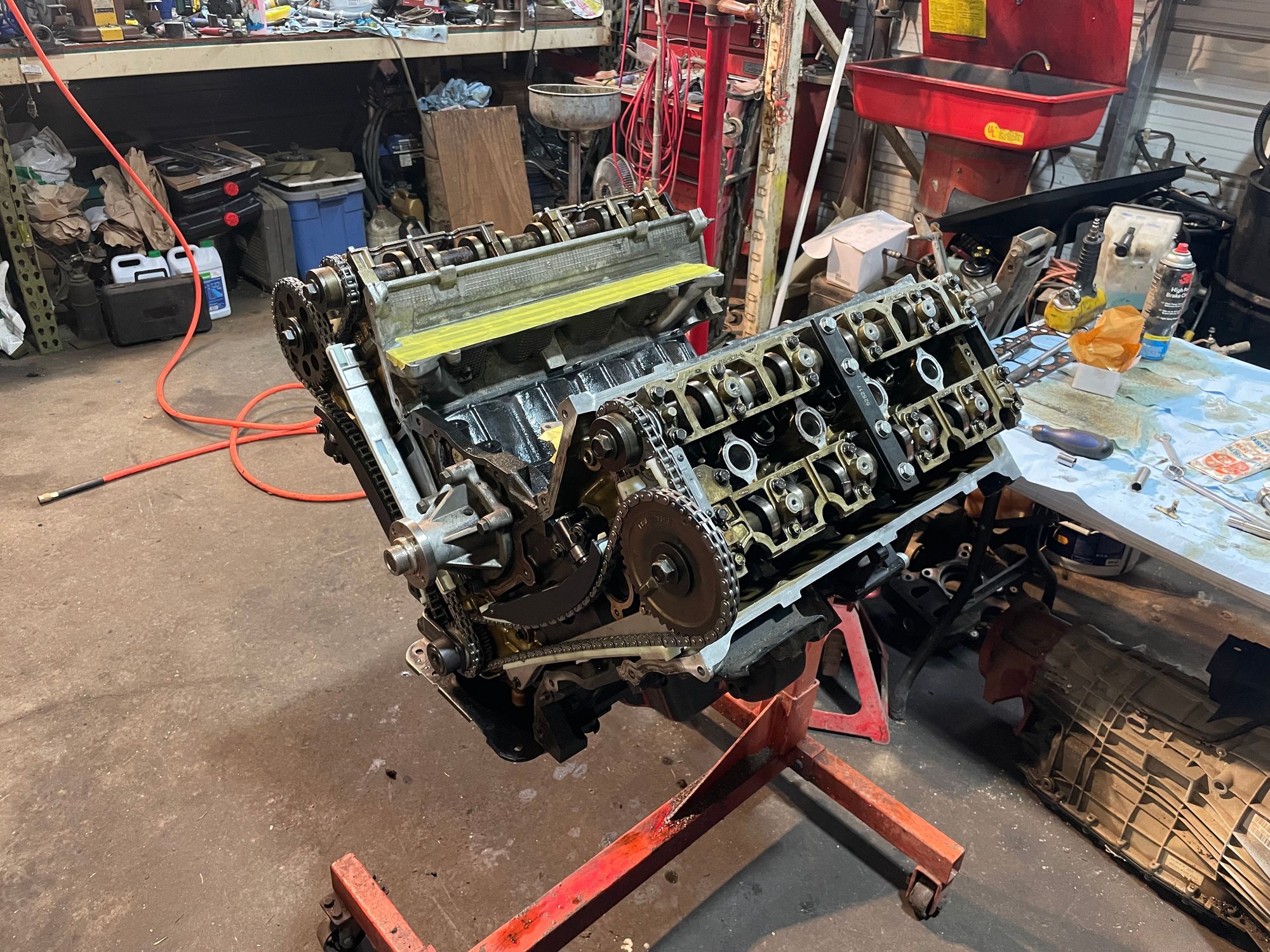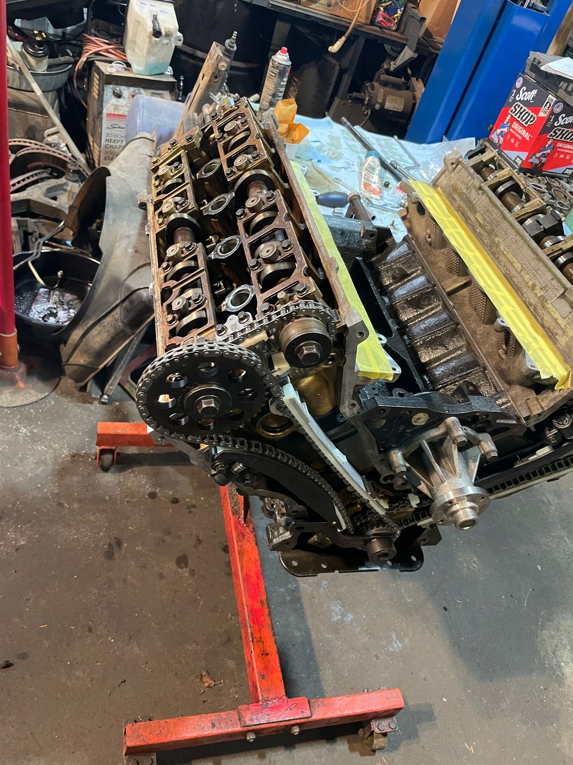 I wanted to pull the heads to make valve seal replacement easier and to look at the bottom end. The engine has great oil pressure and the pistons are not washed at all. So the short block will run as is. Got all 32 valve seals replaced and the valves, guides and seats are nice. The seals were tired and the hot rear corners were not sealing at all. They had no resistance on the stems or the guides. Ready to clean and reassemble. All new Cloyes chains, guides, tensioners and gears. Felpro gaskets and Motorcraft thermostat and oil pressure switch. Should be together by the weekend, then pull the engine that is in the car and swap this one in.