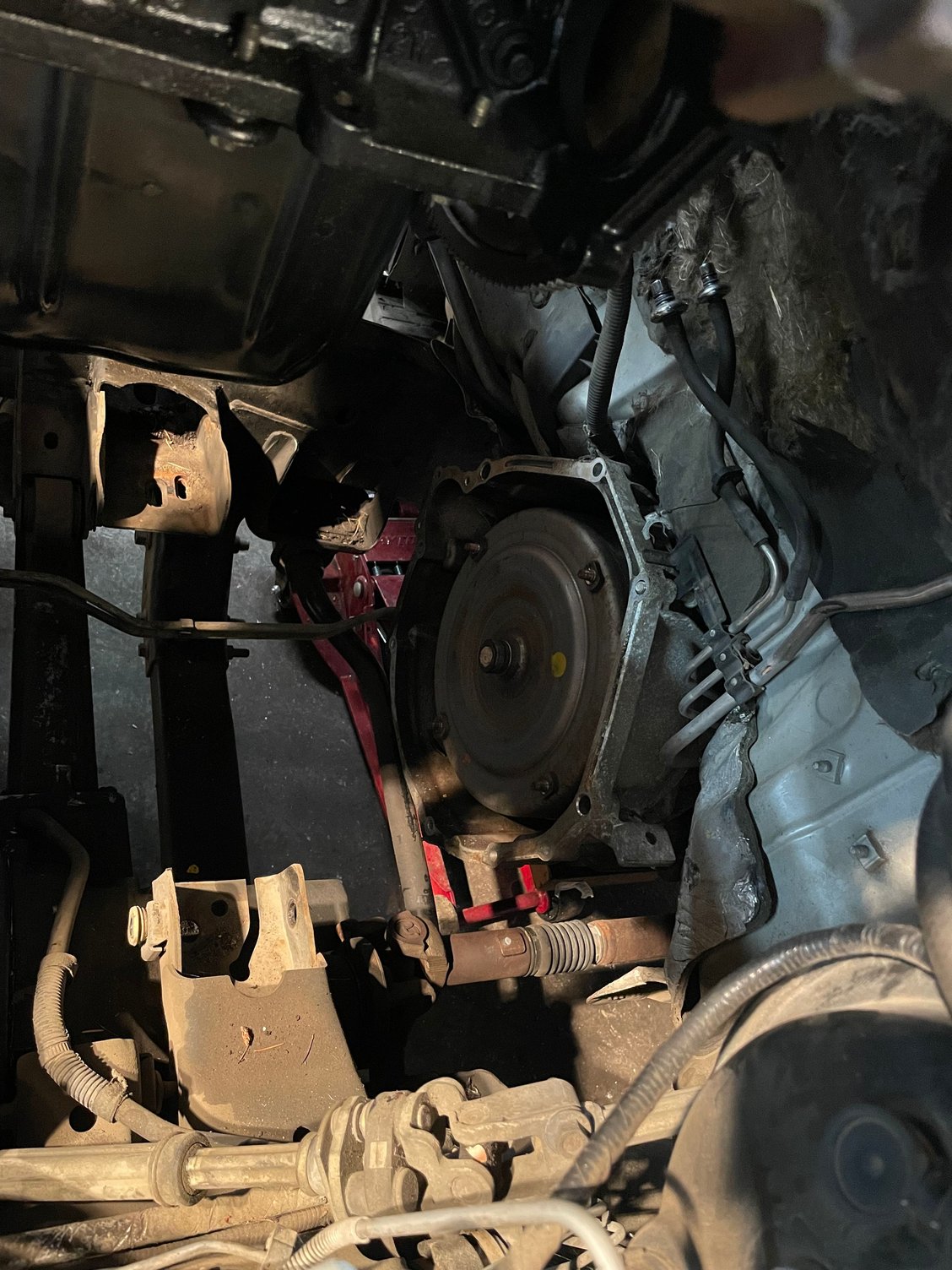 One PM on the West coast and it is in the chassis. Those of you with Ford experience will recognize the studs on the torque converter. An added joy at assembly time. The engine compartment is tight dropping it in and it has to go back 12” under the cowl.