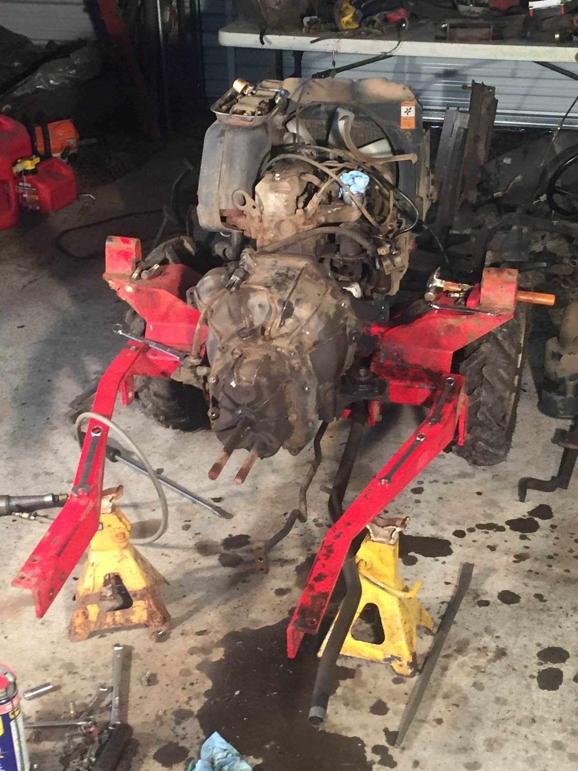 I have a 1995 Massey Ferguson 1210 4x4 compact tractor and the original clutch is finally out of adjustment. Which means I have free pedal and the cluch slips so it is time for some major repair. You think replacing a clutch in a car ia a pain you should work on tractors. The engine is structural in a tractor they do not have a frame like a truck. To replace the clutch you have to split the tractor. My little tractor has a front end loader so there is a frame that comes with the loader to transfer load to the complete tractor. Here are a few pictures of where I am now, I am still removing the bellhousing. I have a nice shop but no heat and we got our first snow of the winter last night.