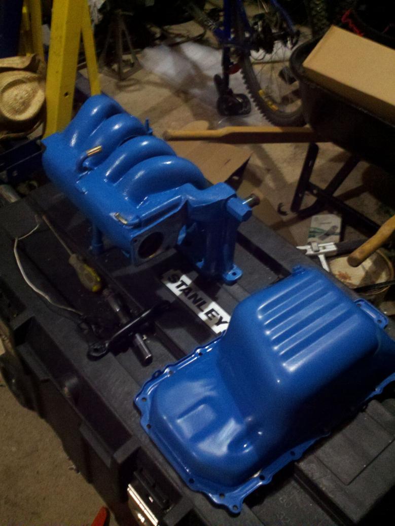Cleaned all the nasty out of my intake manifold, then shot it (and my new oil pan) up with some paint. I plan on putting the homecoming gauges in the car on thursday