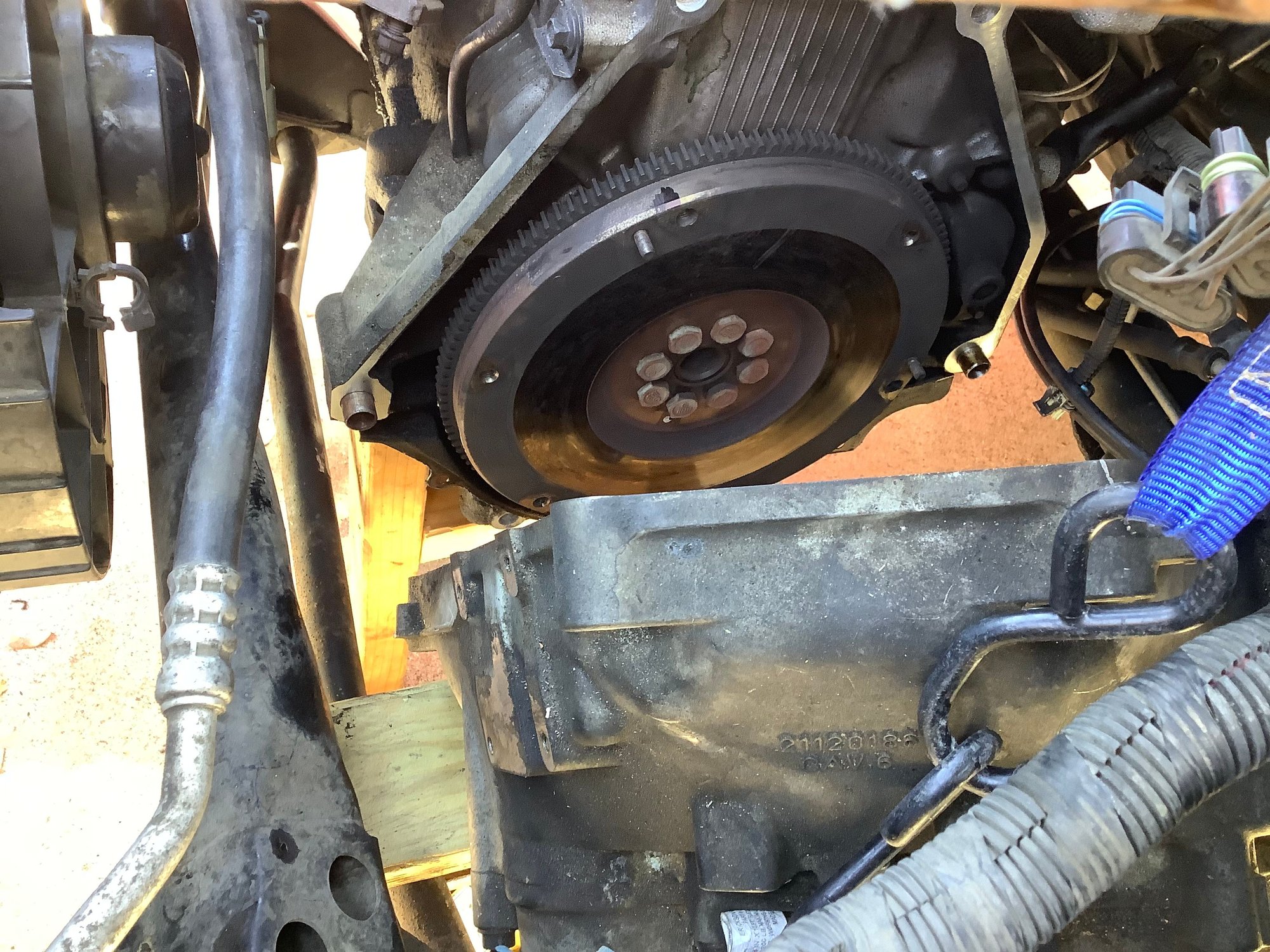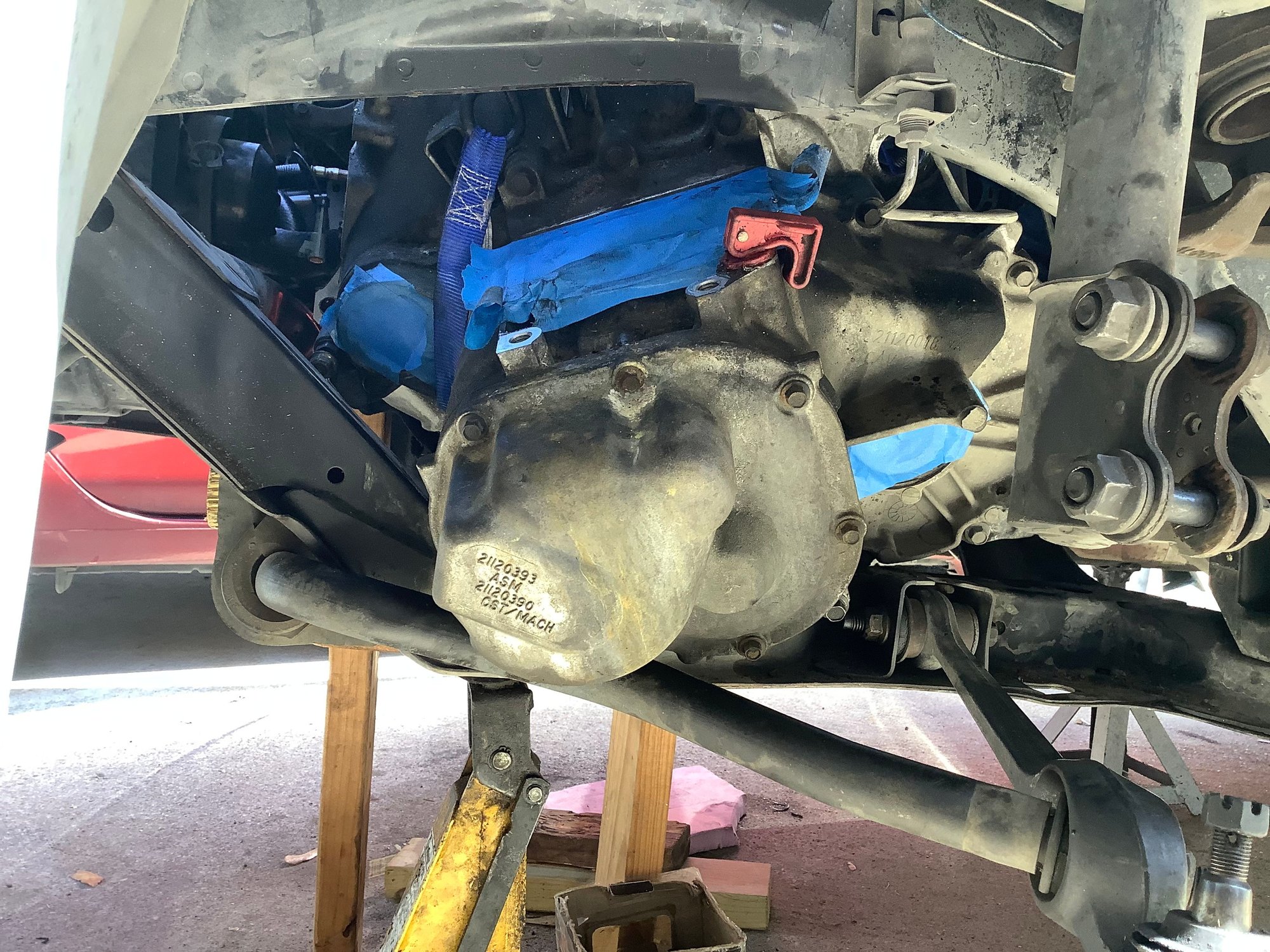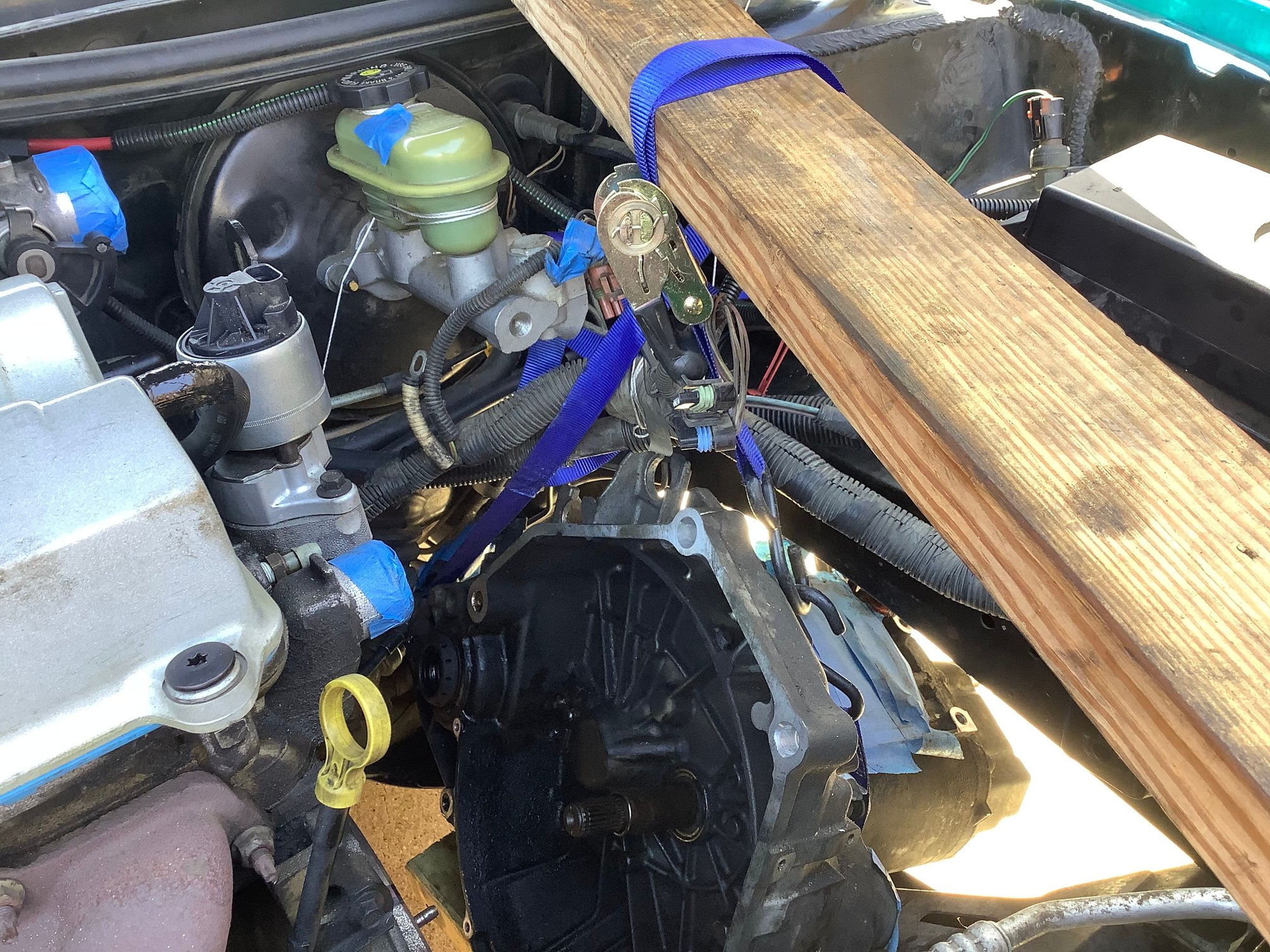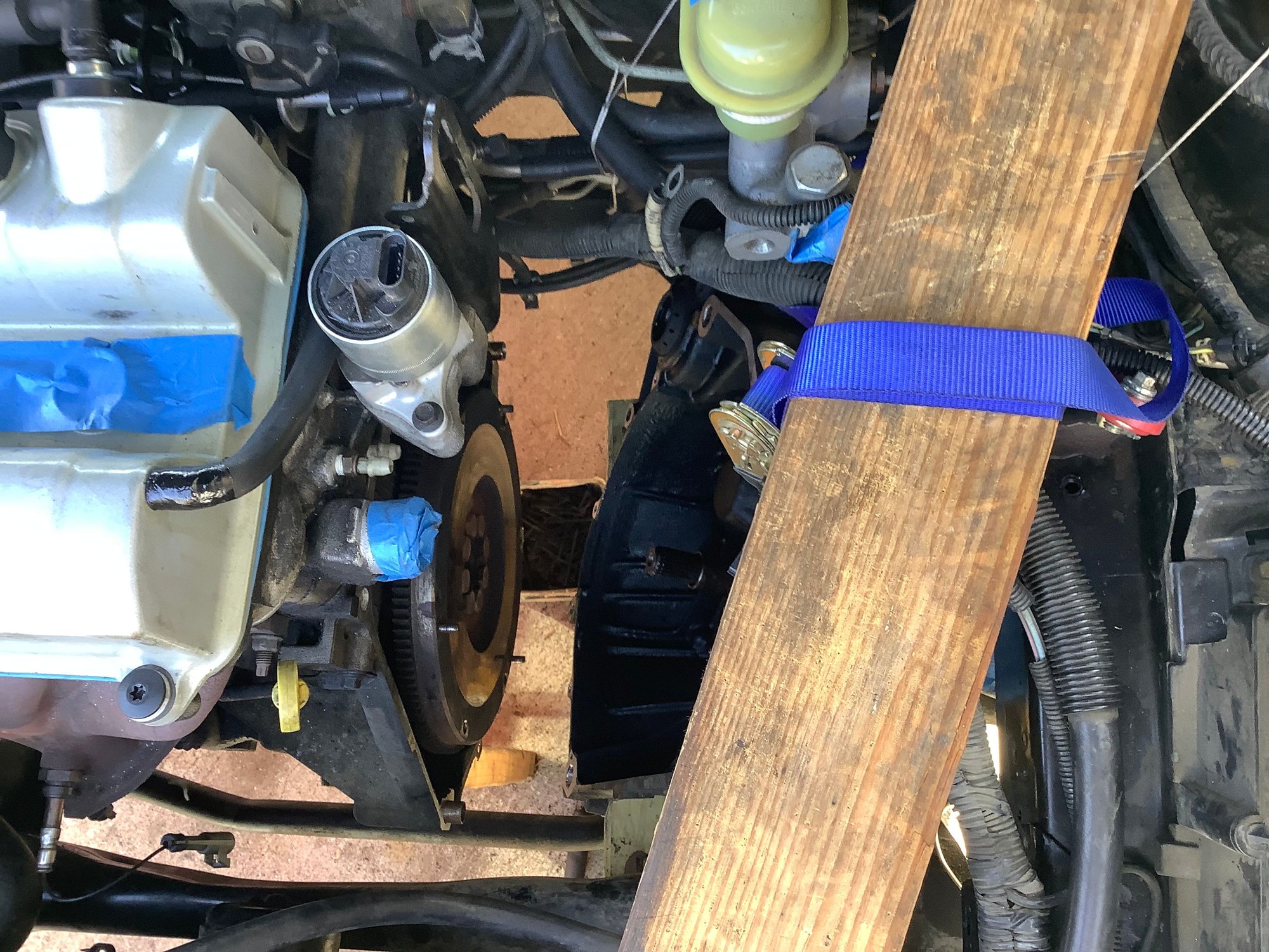 I understand that this could be construed as shade tree mechanic stuff but I have no lift or special tools but I do possess a great deal of ingenuity. So the pictures are showing an alternate method of supporting the engine from underneath. If the car is on jackstands , as it should be, then the car is stable. So how do we keep the engine supported? Measure from a solid flat spot on the bottom of the engine straight down to the concrete floor. Cut a 2X4 , do not cut it too short. You should have to tap it into place with a hammer. Duplicate that process for the opposite side of the engine. Then measure distance between the two boards and make a cross- member. Screw them together with 2 screws at each end. See photo. How do we support the trans. ? Other photo shows a 2X4 laying horizontally from firewall top edge to radiator core support. Don’t forget to remove the rubber weatherstripping! I used a ratchet strap wrapped around the bottom of the trans and over the top of the 2X4. Only tighten the strap enough to hold the weight not lift it yet. After following the steps that Derf provided, the two sections separated easily. Make note that for this to work correctly, you must remove shift tower to allow enough room for the trans to move sideways into driver side wheel well. Photos show all. Just for extra safety I have a floor jack also under trans. See photo. No other support for engine except the new TAM installed and the dog one under the crankshaft.