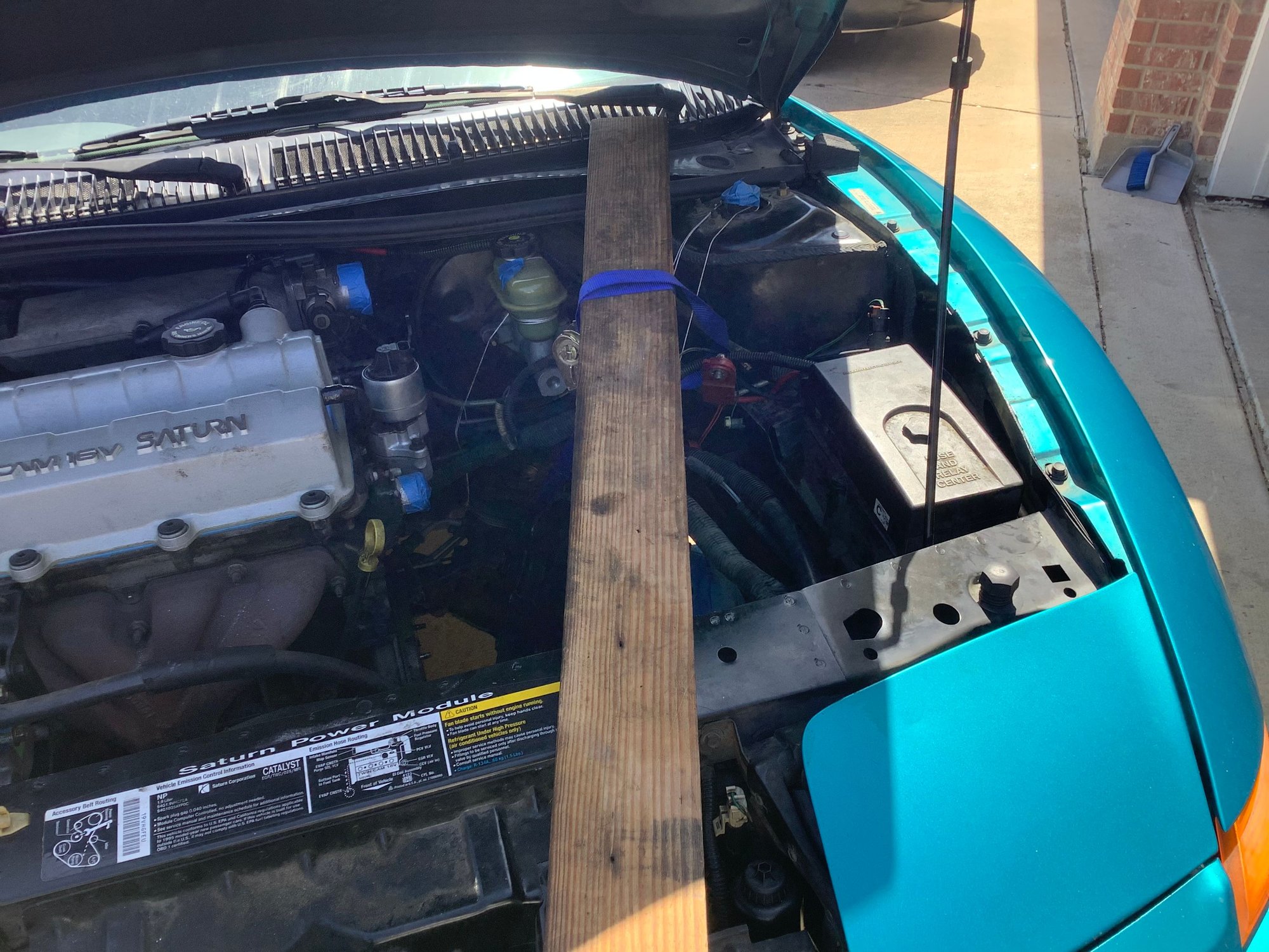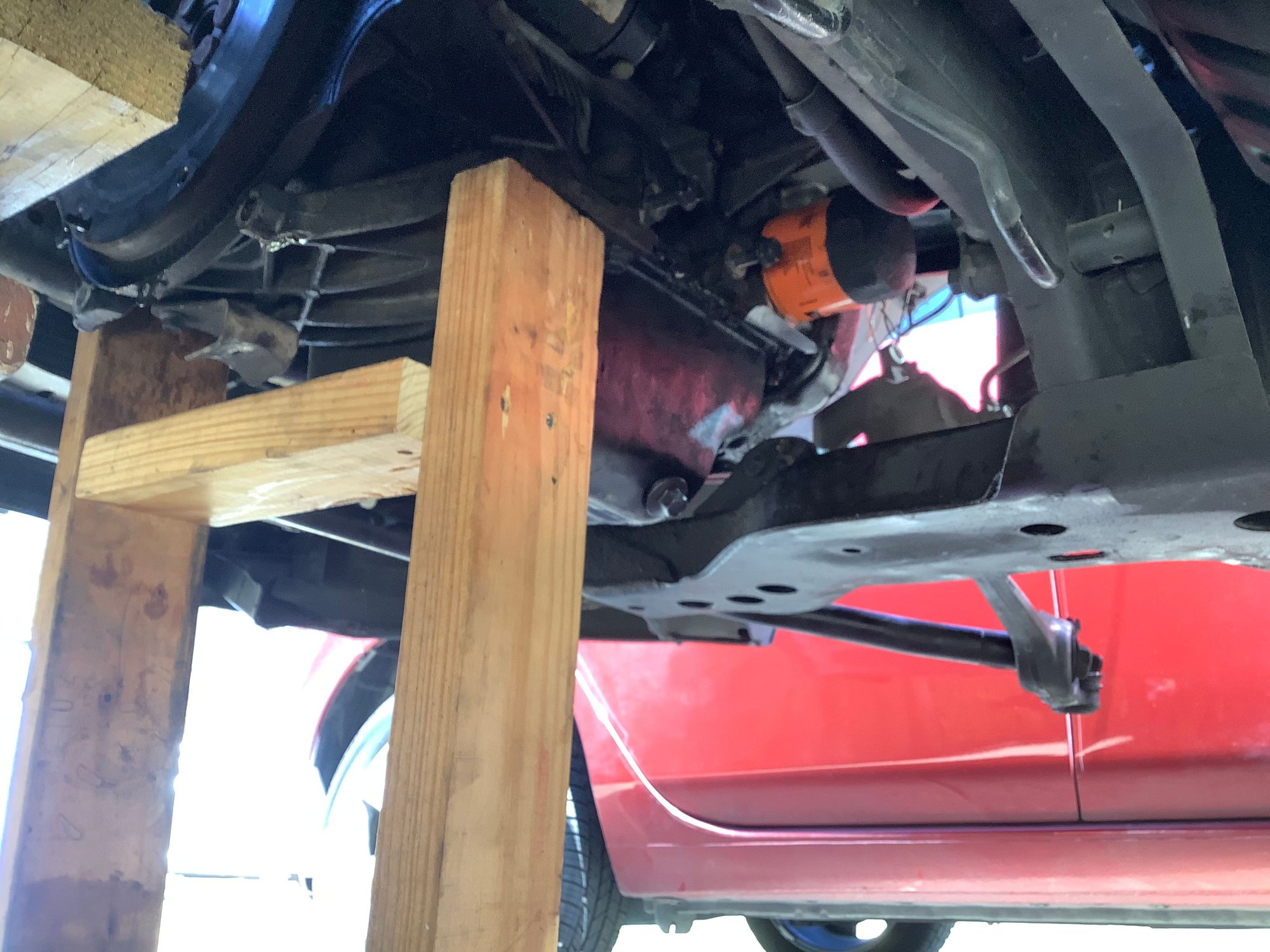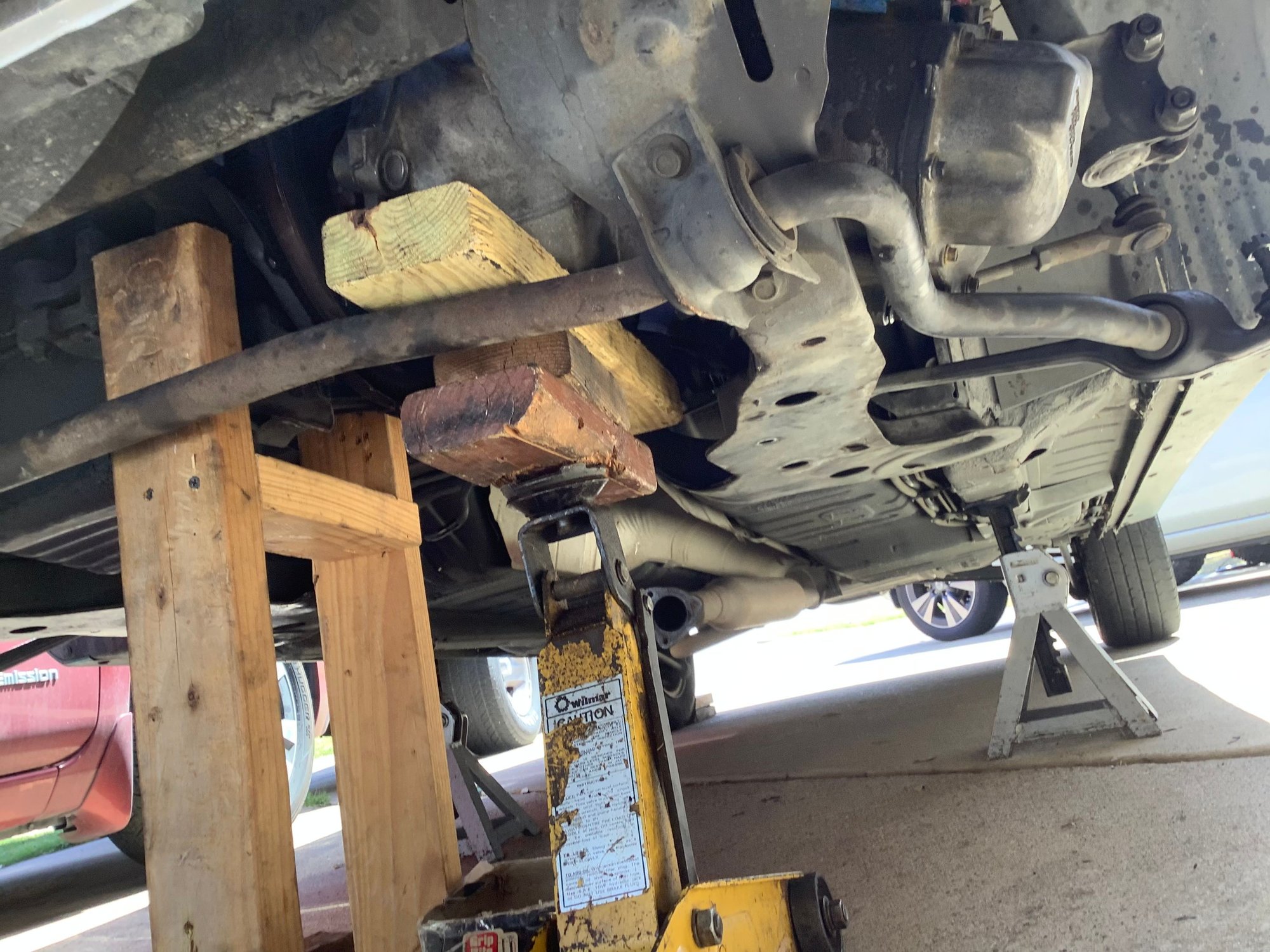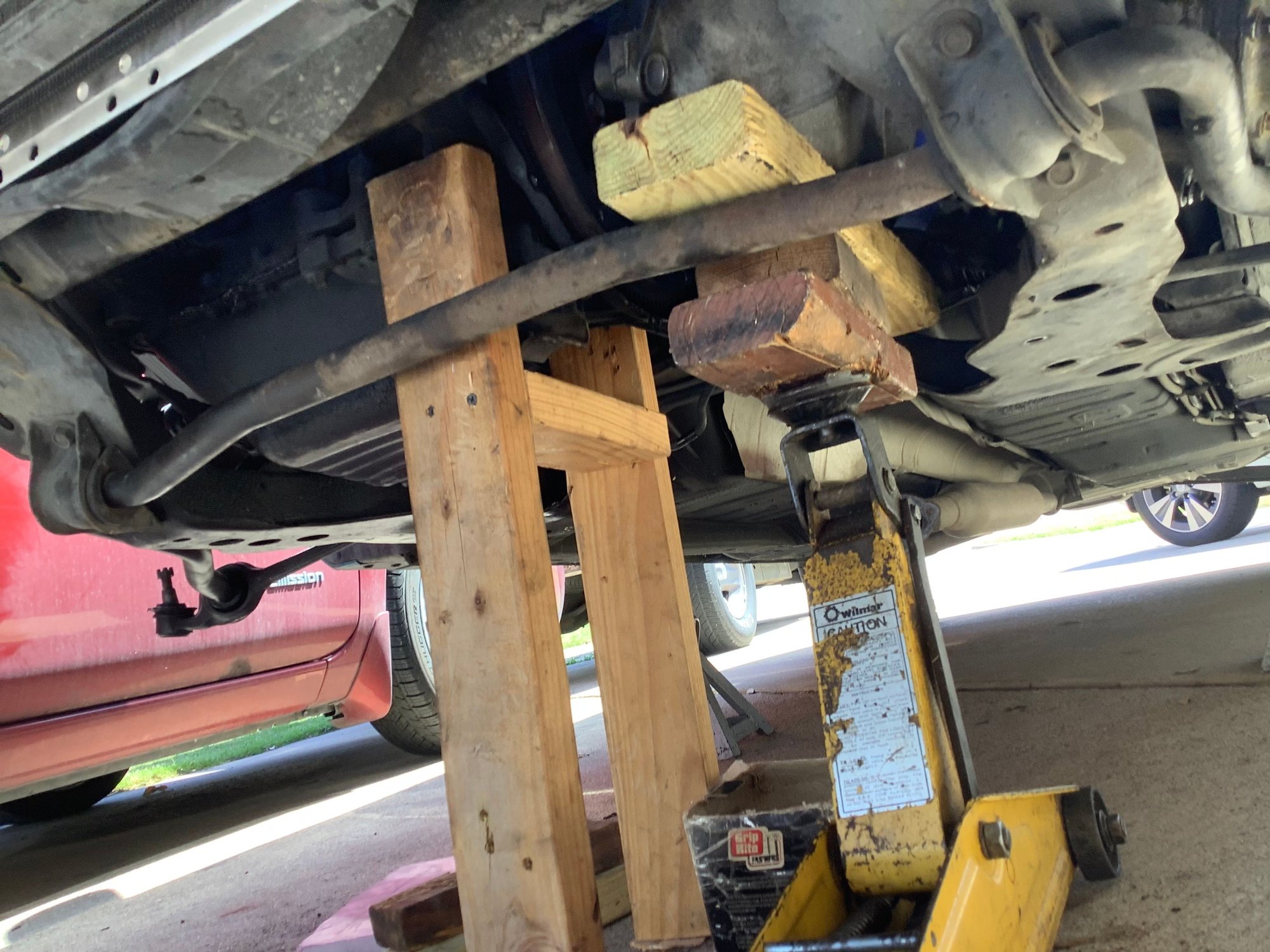 I understand that this could be construed as shade tree mechanic stuff but I have no lift or special tools but I do possess a great deal of ingenuity. So the pictures are showing an alternate method of supporting the engine from underneath. If the car is on jackstands , as it should be, then the car is stable. So how do we keep the engine supported? Measure from a solid flat spot on the bottom of the engine straight down to the concrete floor. Cut a 2X4 , do not cut it too short. You should have to tap it into place with a hammer. Duplicate that process for the opposite side of the engine. Then measure distance between the two boards and make a cross- member. Screw them together with 2 screws at each end. See photo. How do we support the trans. ? Other photo shows a 2X4 laying horizontally from firewall top edge to radiator core support. Don’t forget to remove the rubber weatherstripping! I used a ratchet strap wrapped around the bottom of the trans and over the top of the 2X4. Only tighten the strap enough to hold the weight not lift it yet. After following the steps that Derf provided, the two sections separated easily. Make note that for this to work correctly, you must remove shift tower to allow enough room for the trans to move sideways into driver side wheel well. Photos show all. Just for extra safety I have a floor jack also under trans. See photo. No other support for engine except the new TAM installed and the dog one under the crankshaft.