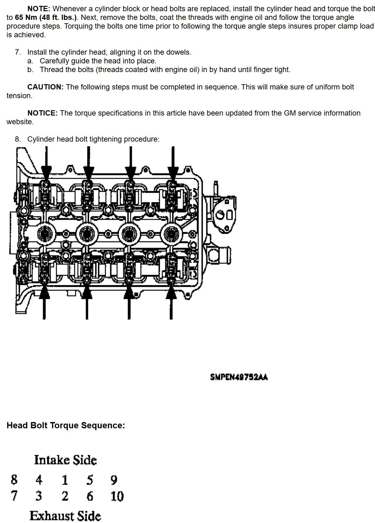 Yes Derf, opinions are all over the place on this. On a Saturn FB page there are supposedly former Saturn techs that said they used the old bolts all the time and then other have stated to changed them. I figure since I found the new bolts to put them in but the question is how is the best way to do it. The engine is completely done with head, timing chain and cover to the oil pan. Some suggested I take everything apart including new head gasket! I believe there must be a better way to skin this cat. I dont want to remove all of them at once because I believe i would have to mess with the timing chain. There is a reason for putting the head on before the timing chain. I cant help but think removing all the bolts with timing chain still in place would cause some forward slight tipping tension on the head. That is why I think removing #1 center intake side bolt and placing the new bolt in place and torque procedure with the 48 Ft-lbs then move to next bolt remove and torque to 48 Ft-lbs until i have finished all the bolts. Where I would differ, I would not take out all of them at once but take the first one out oil it and replace and torque then proceed to the next bolt. If the was a way to keep the timing chain in place after removing the cam sprockets with chain intack from the cams I would do that. Or if anyone has taken all the blots out and replaced them with the timing chain in place with out causing head warpage I would try that. Do you know anyone you could maybe help in my decision? That it for now i await more responses