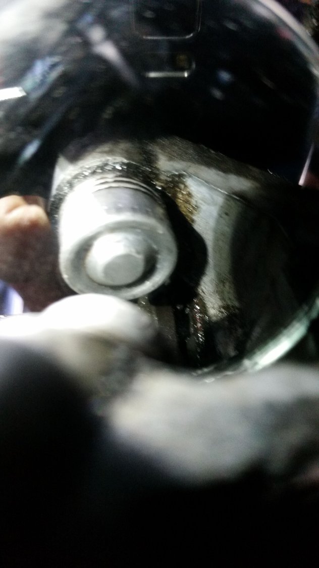 Well, the weather hasn't allowed me to do further investigation until today. Here is a pic of the bottom of the pin that holds the "L" shaped shift bracket on the transmission. My initial take on it was that it's some type of round nut that might just need to be adjusted to tighten, what appears to be, the threads underneath it. "Or" what looks like threads could be a spring. I need to get in there and see if its' adjustable.