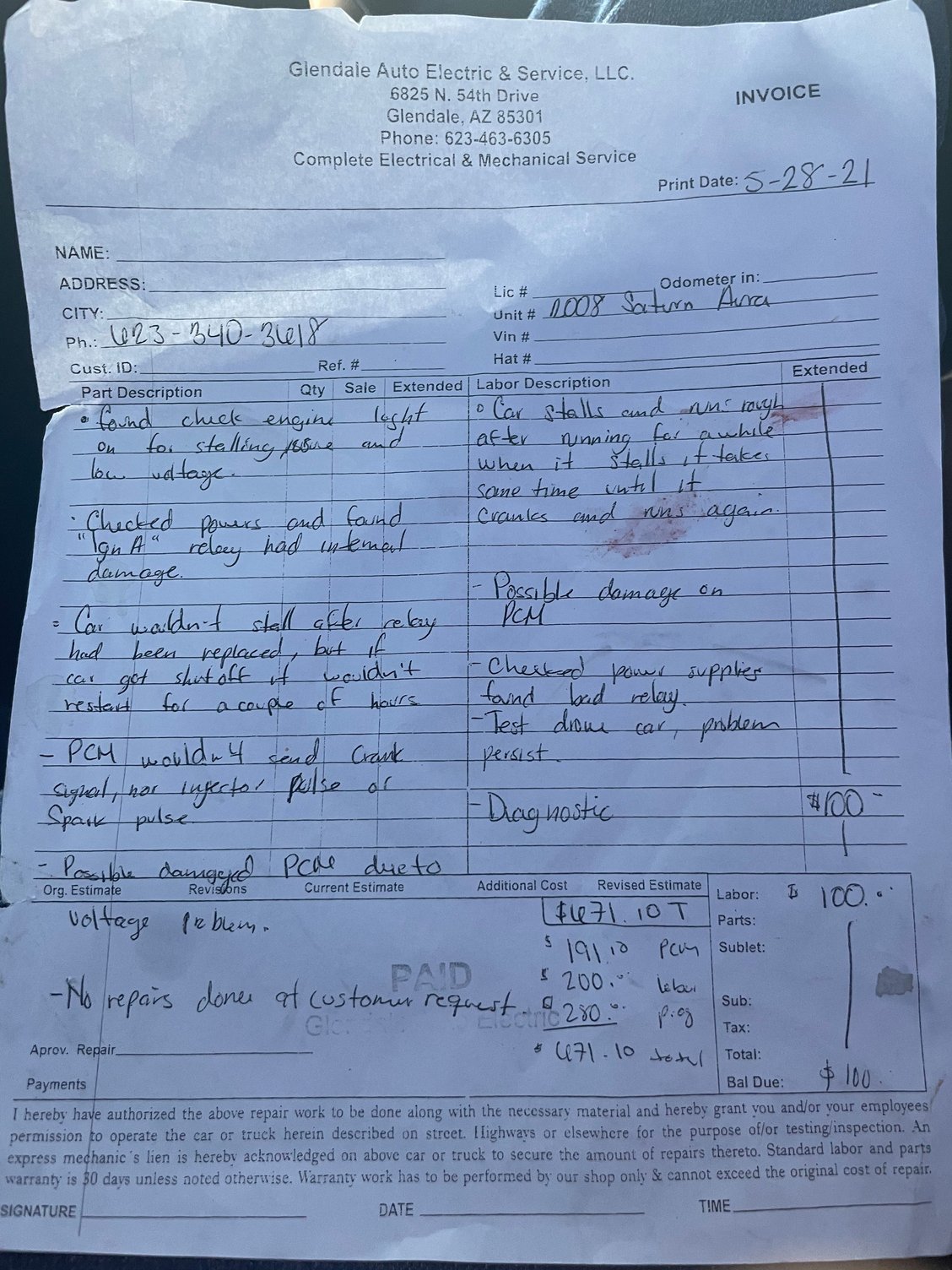 Could you please type in their diagnosis from the invoice, including any "codes" they found like Pxxxx, Bxxxx, etc. and the parts required to fix it.