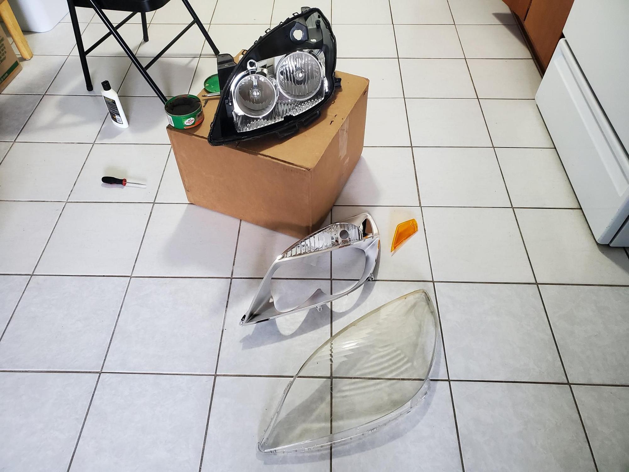 So I also bought a cheap, faded OEM replacement as a temporary headlight to use while the paint offgasses from the modified set.