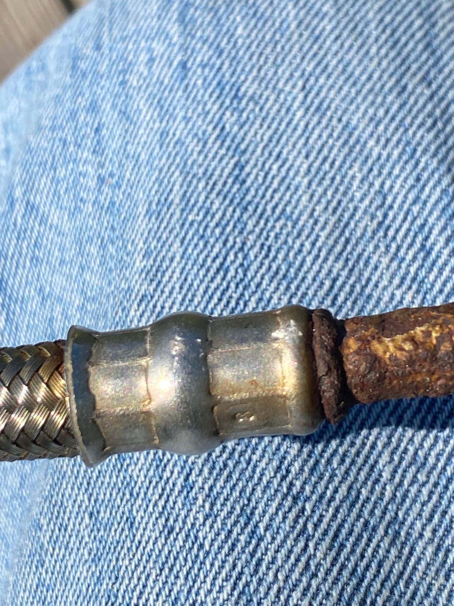 Ok all places I have gone to say it is discontinued. NOT going the route of the cuban cigar scam, as nearest junkyard is almost 45 miles away. I can fabricate one if I only knew the name of the crimped connector that connects the steel to the mesh line, here is a pic. I can get the materials and tools but need name of connector shown here.