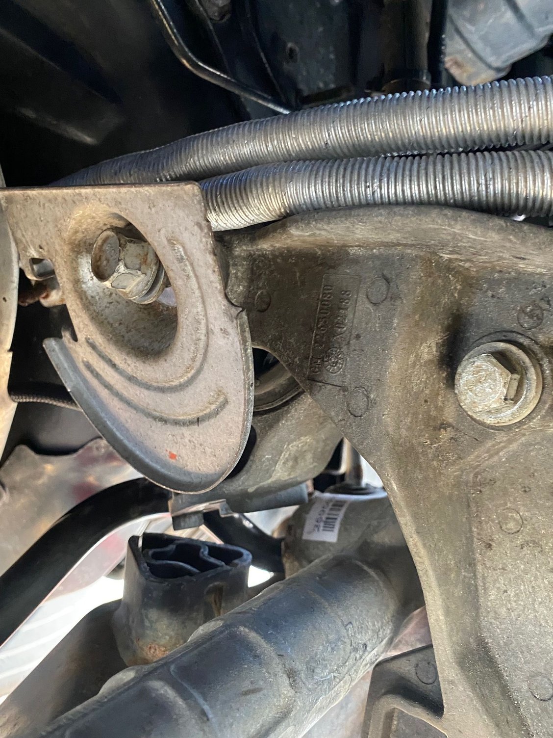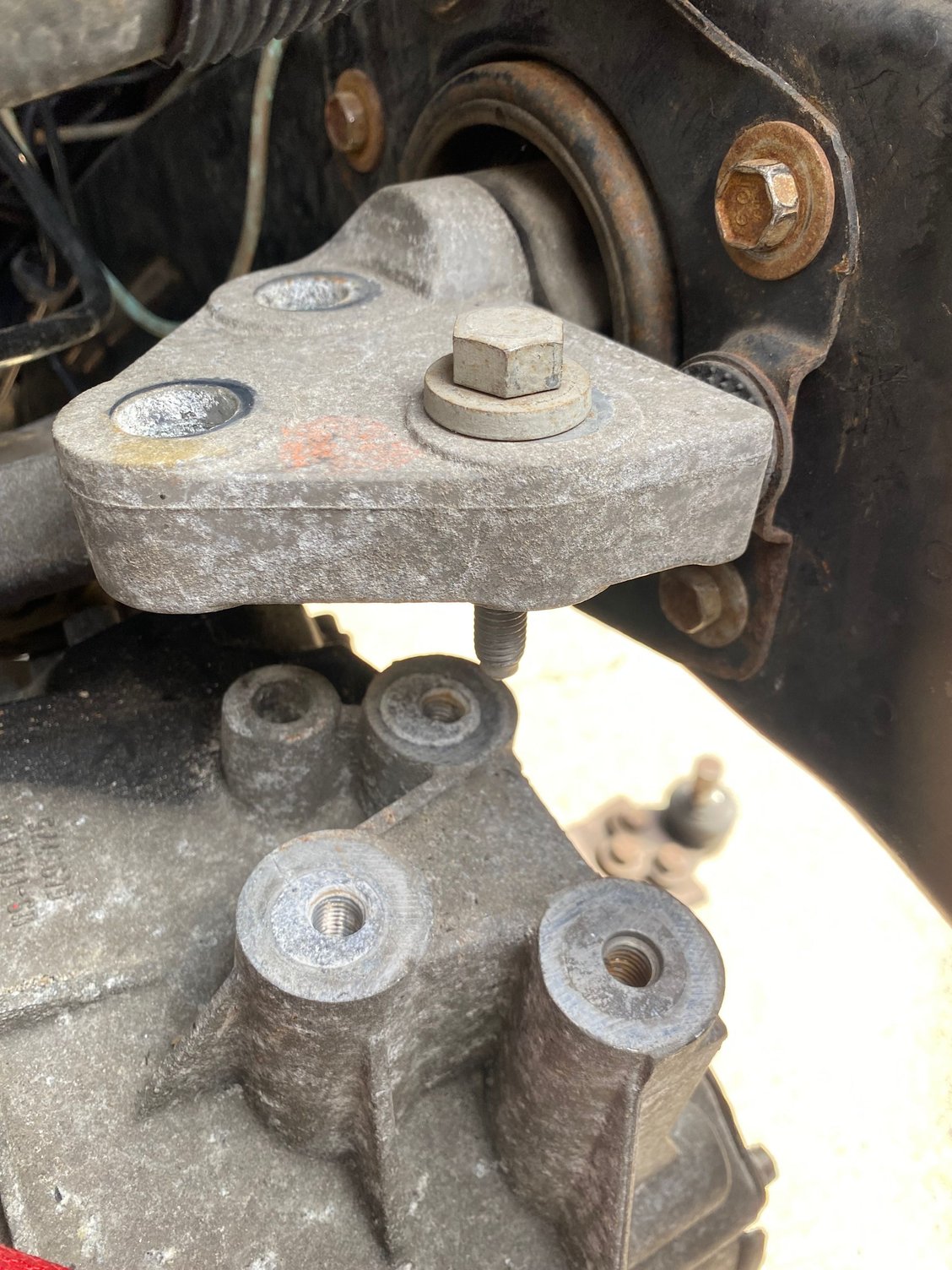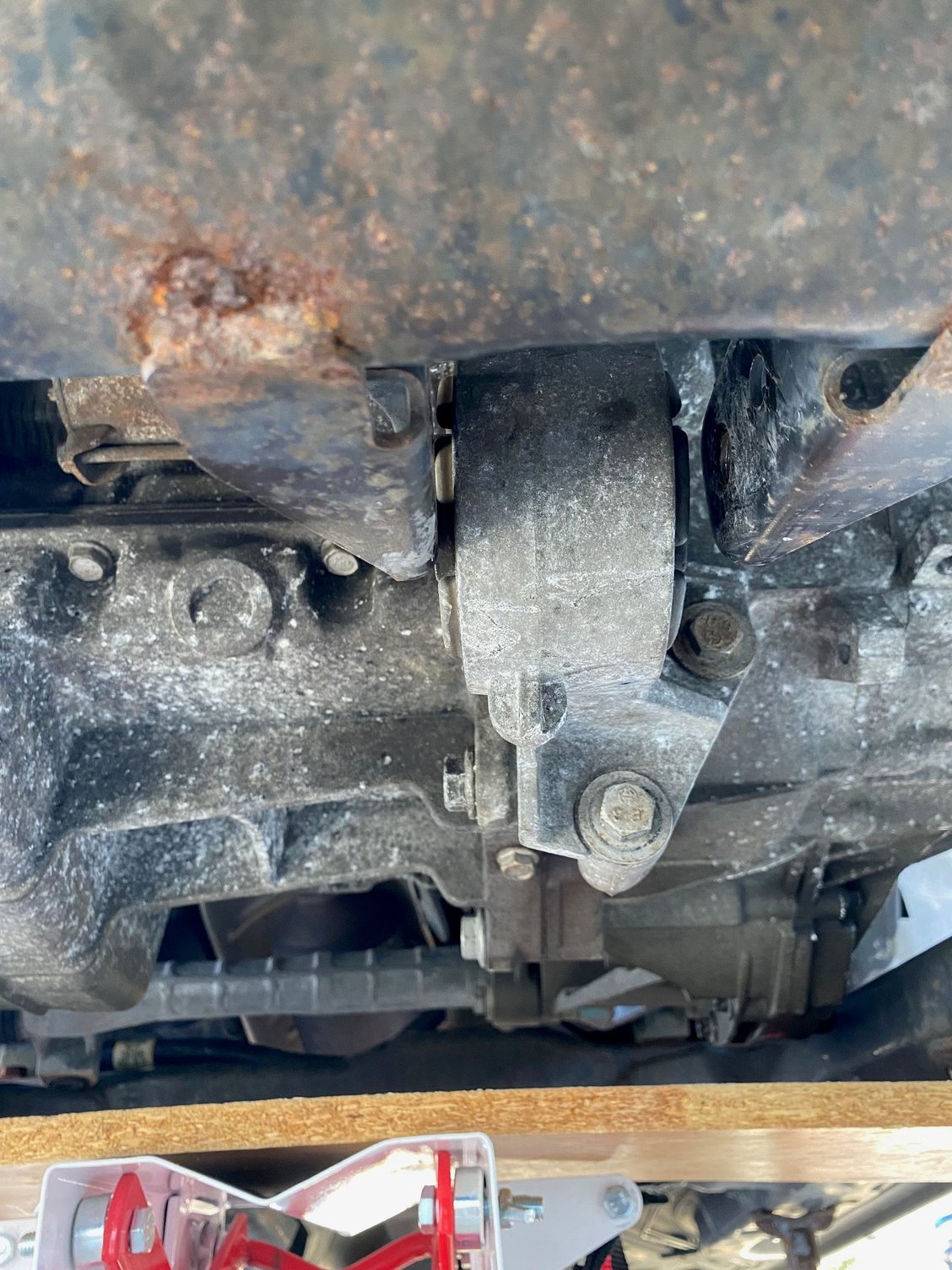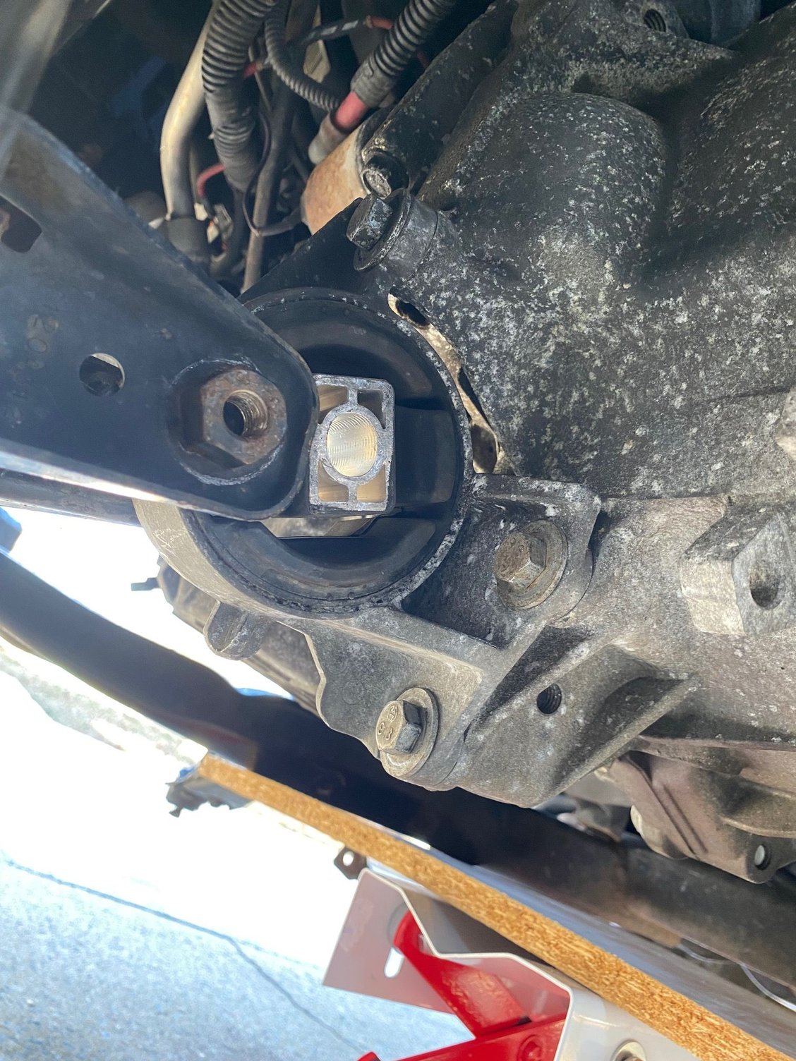 In my attempts to gradually shift things with jacks to see if things would eventually settle, I loosened the passenger side engine mount, seeing if shifting the weight/level on that side would do anything, which it didn't. For now, I'll get the subframe back in to further document my issues, and also try getting that top mount back in like you said. It's supposed to get cold and snowy this weekend, and it's been a pain working on this outside. I hope I get this solved soon so I can finally close the hood at least haha