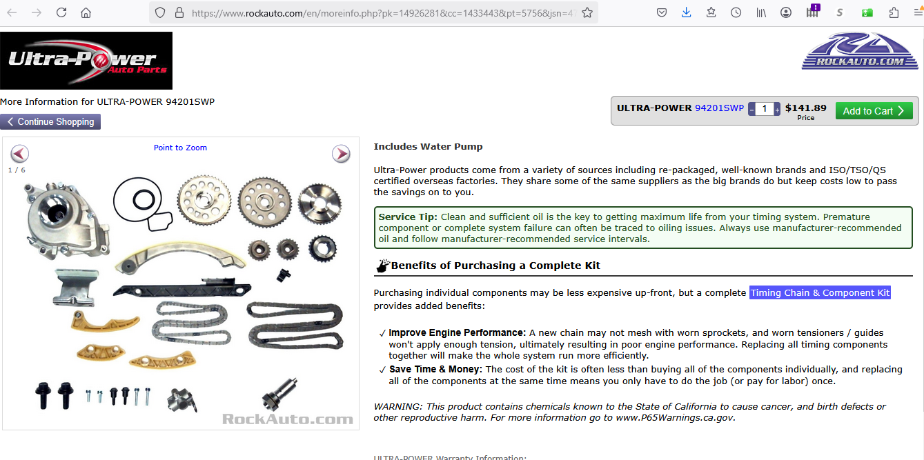 I was looking at kits and watching videos on timing changes and everything with that. Trying to get a visual for everything. A select few things wernt adding up, but eventually figured it out. Sometimes tho my mind skips a step which makes me more confused, unnecessarily. Like trying to figure out what the hell one of the parts was in a kit i was looking at. Even after matching up all the other parts and checking the names listed for each of em.. my dumb ass missed the whole... checking the name of the part i couldnt figure out lol. -_- Turns out it was a water pump lol. That kit also had the tensioner in it as well. And i was able to see the tensioner on one of the videos. So that helps. So my questions now fall to the thermostat and belt you mentioned. This was the kit i was looking at. I had gotten some parts there before so that was just where i started looking. I tried taking a look at cloyes.com and found what looks to be a kit with the same items. Unfortunately, it doesnt list prices for them. It just says to contact sales. Which i find quite annoying. So i was wondering if you usually go through that ordeal if maybe you get there brand through a third party seller or something else? While i do want/need a product that works, i also have to be incredibly careful of every penny. Being on disability does not make one flush. |