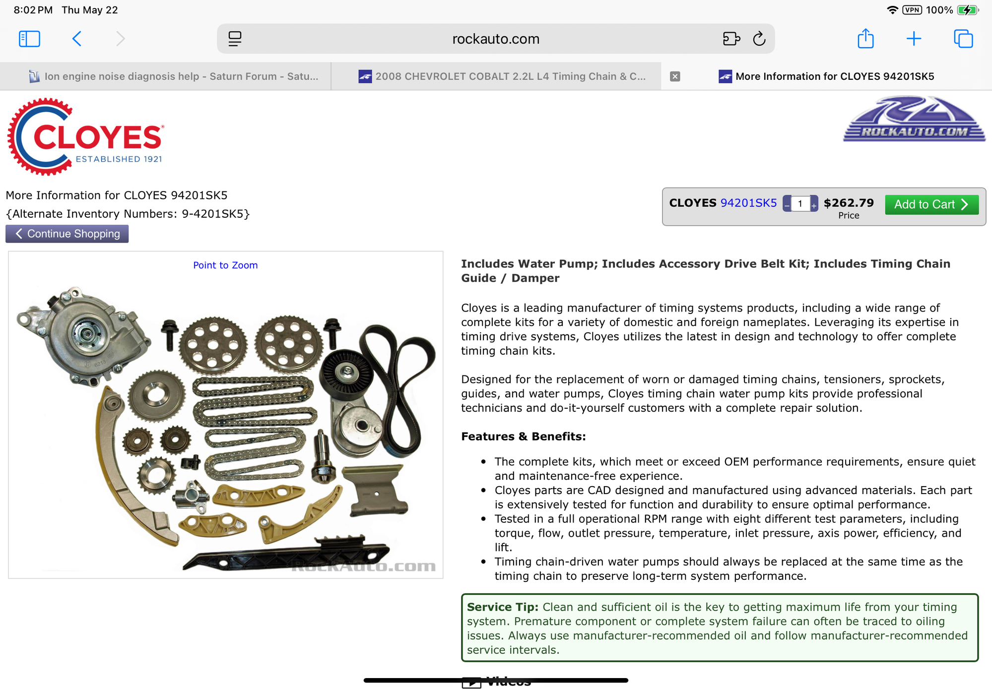 I purchase Cloyes parts because they are comparable to what the factory installed when the car was manufactured. I also keep my cars a long time and when I repair cars and trucks for customers they also expect to only make this repair one time.