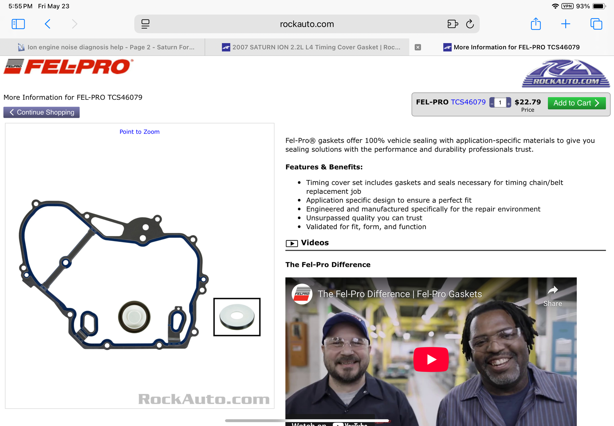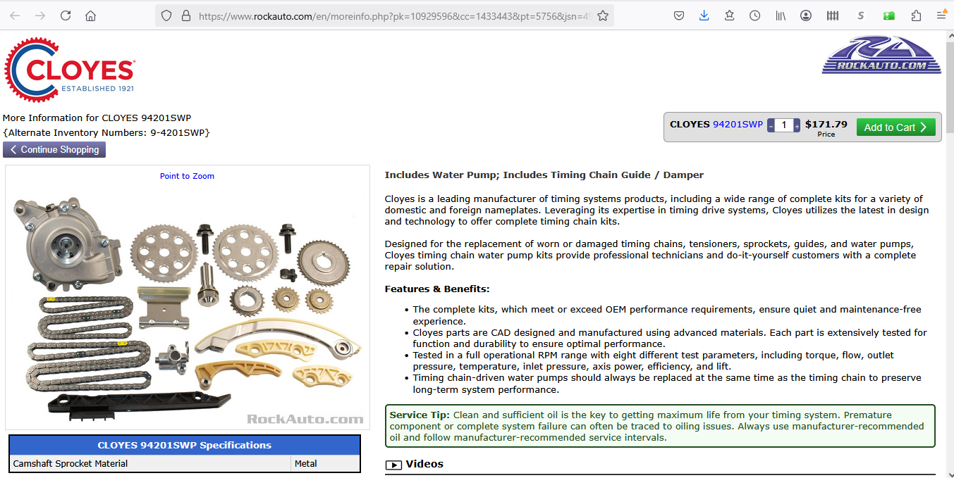 I did find the cloyes equivalent of what i was looking at. But i noticed that the list of whats included it did NOT include the water pumps gasket or O-ring that you mentioned. Seems odd not to include a gasket in the kit. :/ Technically a few screws less then the other one i mentioned/posted before. So if i went with cloyes, im guessing id have to get a separate gasket and o-ring? And do i need those extra few screws? Edit: I also noticed the cloyes two big gears have all circle cut outs in there and not the triangle/diamond cut outs. Why is that? https://cimg0.ibsrv.net/gimg/www.sat...4ab1b488d6.png This was the one i posted earlier, just for easy comparison https://cimg3.ibsrv.net/gimg/www.sat...00b1e4f201.png |