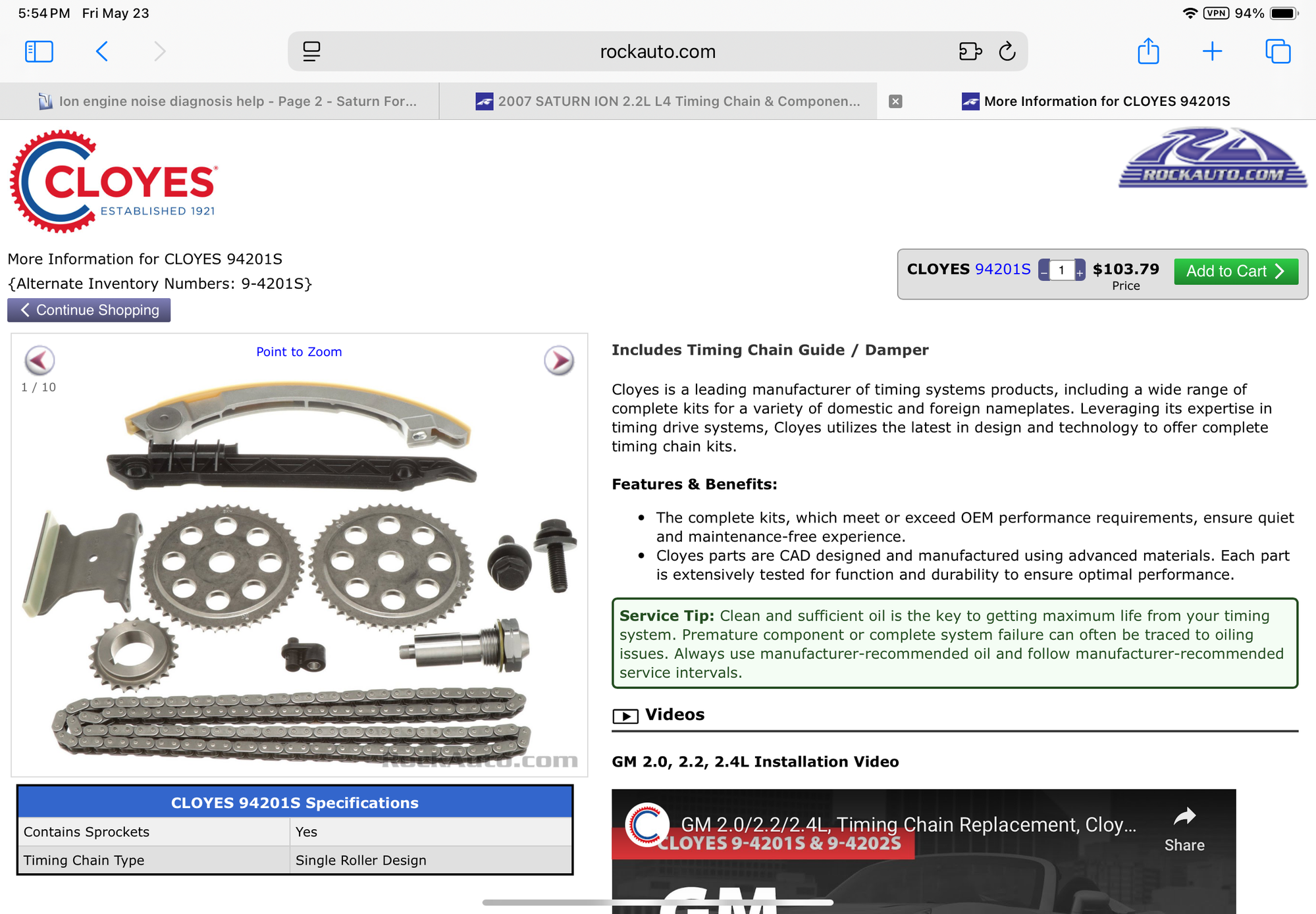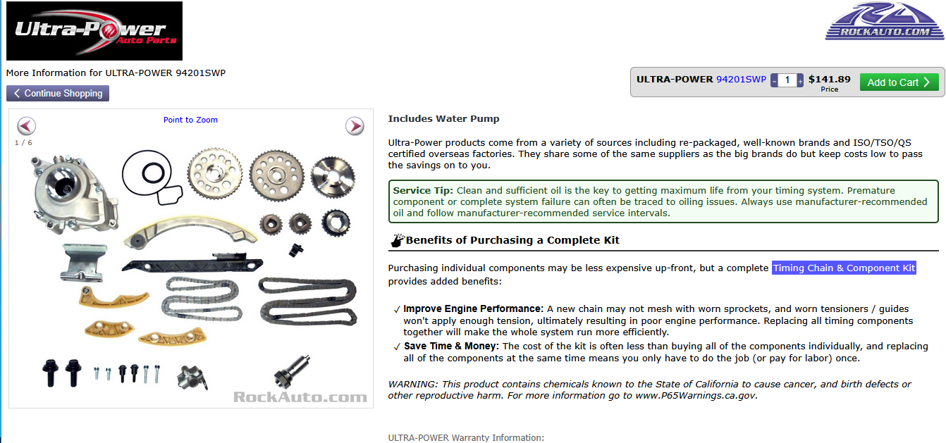 If you can afford these you can always address the water pump as a stand alone repair when needed in the future. I would purchase these three quality kits to repair your noisy chain.You can reuse your belt. https://cimg5.ibsrv.net/gimg/www.sat...8d017680a2.png https://cimg8.ibsrv.net/gimg/www.sat...db9a8e7422.png https://cimg0.ibsrv.net/gimg/www.sat...da0aa481c5.png |