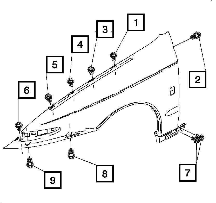 Home >> Saturn >> 2001 >> L200 L4-2.2L VIN F >> Repair and Diagnosis >> Body and Frame >> Fender >> Front Fender >> Service and Repair >> Front Fender Replacement Front Fender ReplacementFront Fender Replacement Removal Procedure https://charm.li/images/DM15Q313/gm130/1694060065/ 1. Remove the front wheelhouse outer panel fasteners. https://charm.li/images/DM15Q313/gm130/1747954729/ 2. Remove the plastic fasteners along the top and the bottom of the rocker panel molding. 3. Remove the plastic fasteners, the rear wheelhouse liner to the rocker panel molding. 4. Remove the plastic fasteners, the front wheelhouse liner to the rocker panel molding. 5. Rotate the rocker panel molding out and down to remove. 6. Remove the bottom rear fender bolts. https://charm.li/images/DM15Q313/gm130/1694052188/ 7. Remove the side marker lamp housing by pulling the leading edge forward and straight out. 8. Rotate the side marker lamp bulb socket counter clockwise 1/4 turn. Pull the socket rearward until the bulb clears the side marker lamp housing. 9. Remove the fender reinforcement bolt behind the marker lamp. https://charm.li/images/DM15Q313/gm130/1747959950/ 10. Remove the front fascia lower front plastic retainters. 11. Remove the front fascia upper front plastic retainers. 12. Slide the front fascia forward. 13. Remove the front fascia assembly. 14. Remove the fascia shoulder bolts from the fender bracket. https://charm.li/images/DM15Q313/gm130/1747968303/ 15. Remove the fender to the front body hinge pillar bolt. 16. Remove the bolts from the fender flange to the upper motor compartment rail. 17. Remove the fender. Installation Procedure https://charm.li/images/DM15Q313/gm130/1747968303/ 1. Position the fender on the motor compartment side rail. 2. Align the fender to the door and the hood. https://charm.li/images/DM15Q313/gm130/1747971332/ 3. Install the bolts to the fender and tighten in the correct sequence as shown. Tighten the fender bolts to 10 Nm (89 lb in). 4. Install the fascia ends over the shoulder bolts extending down from the fascia back. Holes in the fascia are slotted for installation without removing the bolts. The front fascia lower support plate should be on the lower side of the fascia. 5. Install the plastic retainers from the front of the front wheelhouse panel and the fascia. 6. Install the front fascia upper front plastic retainers. 7. Install the front fascia lower the front plastic retainers. 8. Install the fender reinforcement bolt behind the marker lamp. 9. Connect the side marker lamp socket into the side marker lamp housing. Rotate the side marker lamp socket clockwise 1/4 turn to lock in place. 10. Insert the tab at the back of the side marker lamp housing into the fender and snap the pressure clip in the fender. 11. Position the rocker panel molding to the body. 12. Install the plastic fasteners, the front wheelhouse liner to the rocker panel molding. 13. Install the plastic fasteners, the rear wheelhouse liner to the rocker panel molding. 14. Install the remaining front wheelhouse panel outer plastic fasteners. pro multis · About Operation CHARM |