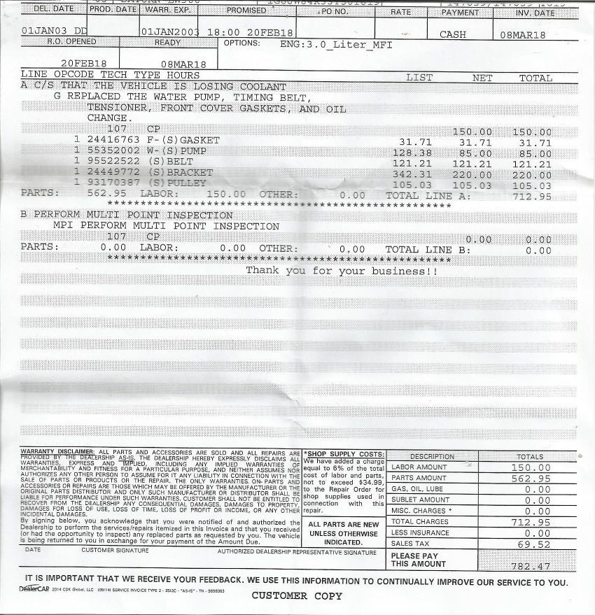 Here is the receipt they gave me. They actually charged half of what they initially told me the labor charge would be... but doubled the cost of parts.