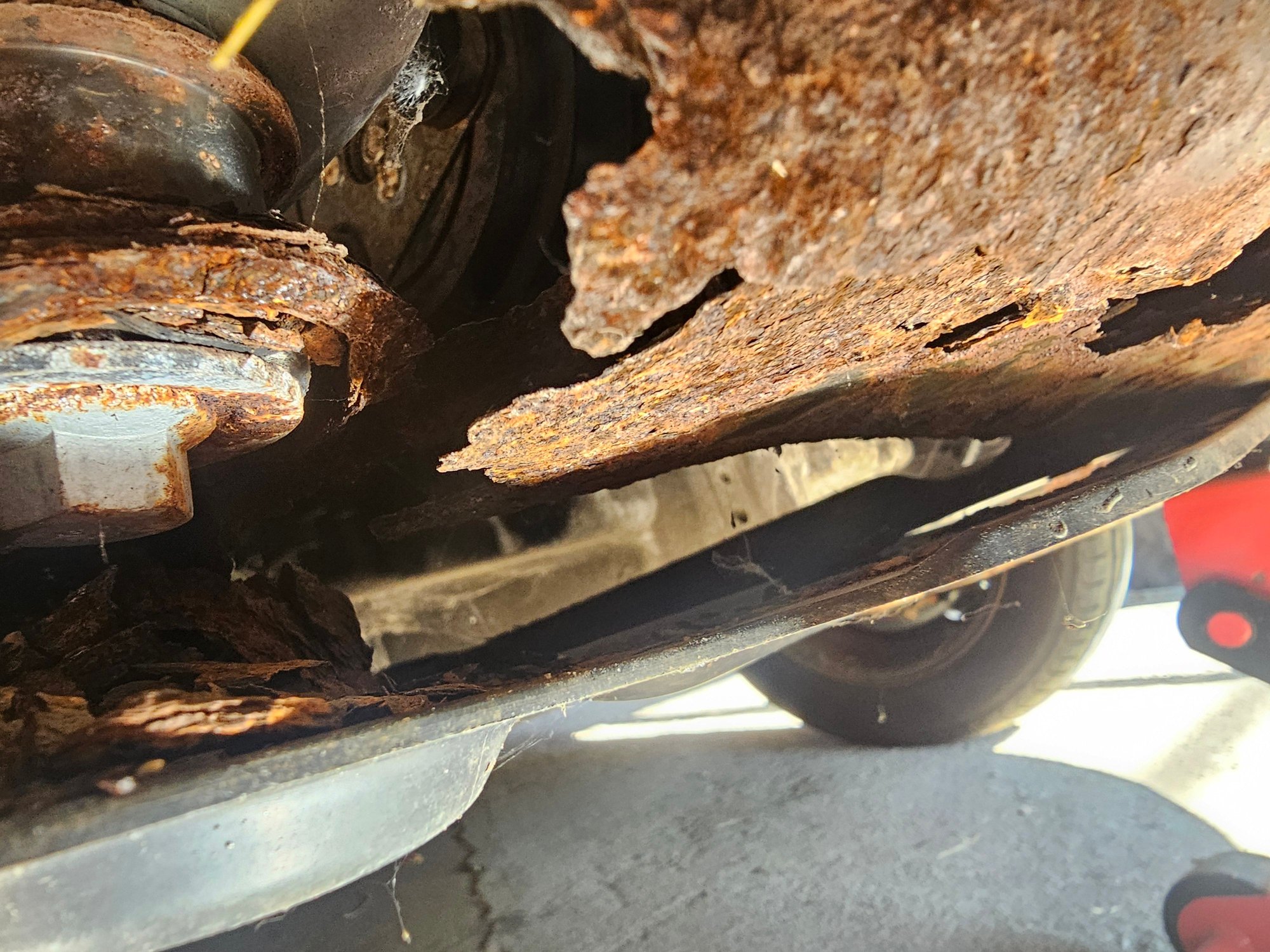 I have a question for everyone I just picked up a 2002 Saturn l100 with 95,000 original miles 1 owner. I was going to do an oil change and noticed the front cradle where the body mount comes down on by the horn is completely gone and this is on the passenger side and a spot on the driver side back behind the door on the back of the cradle are these repairable or are they scrap? This is the front passenger side I moved the skid plate out as far as possible there is a 1-in piece of metal that still attached and barely! This is the back driver side I didn't poke anymore so I imagine it's pretty well gone there too.
