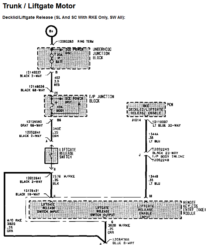 The Liftgate Release Switch is also fed by the IP junction block on circuit 340E. These are precisely the circuits that this diagnostic flowchart says to check in order to determine the root cause (either bad RKE or open circuits). The only problem is, I don't know where the damn switch is. The "Location" section of Trunk / Liftgate Switch is left empty (Thanks Saturn).