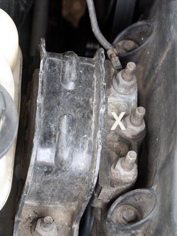 Hi all, I am new to the forum & read through the past posts looking for my problem with no results. My 1999 SL2 with 93 K miles DOHC engine is making a noise on the upper passenger side of the engine. The noise is present at idle and at speed engine cold or warmed up. With a mechanics stethoscope I have isolated the grinding noise to the upper right side motor mount where it bolts to the top of the engine with 3 bolts directly over the idler wheel. (See image) The X indicates where the noise is most pronounced with the stethoscope probe. I can find no info in my Haynes manual for servicing the idler wheel as this is where I think the noise is coming from. Any input would be greatly appreciated.