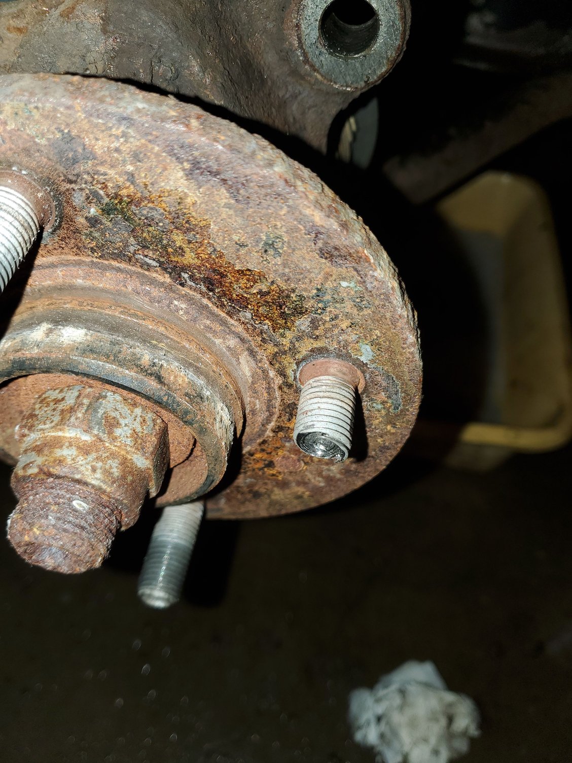 You need to rotate the hub to the position where the stud can actually slide past the knuckle on its way out. I believe this is at 6:00 but don't remember. Anywhere else and the head gets trapped by the knuckle and you can't pull it out.