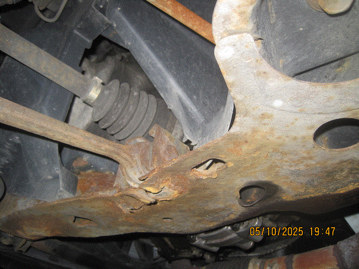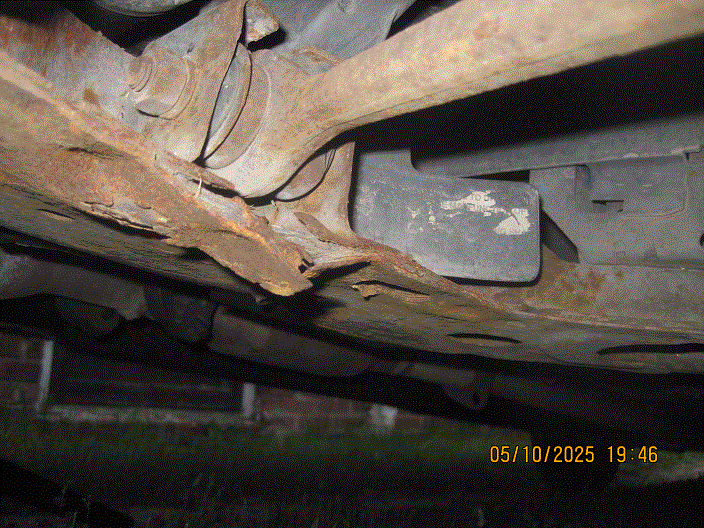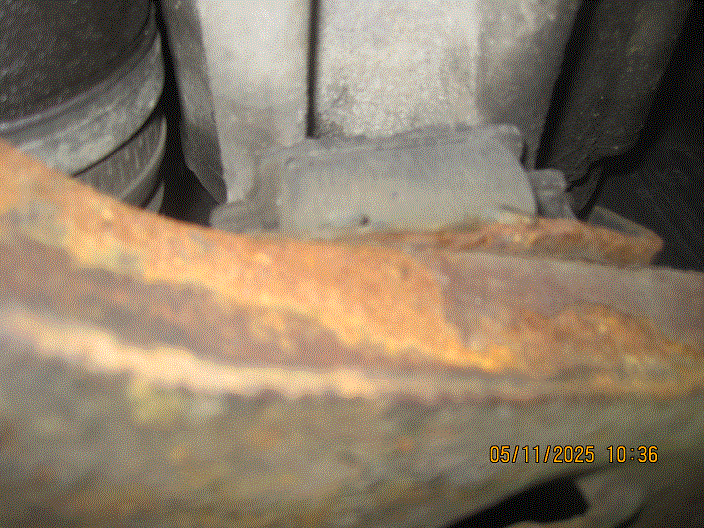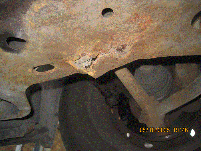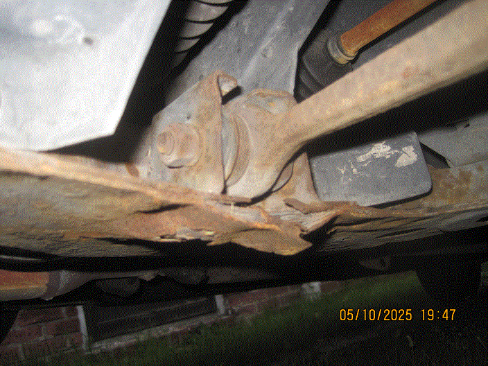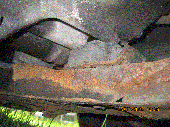 The second is the condition of the sub frame. The rust, unavoidable in this part of the country, now has gone all the way through in one spot, right behind the left front wheel (see photos). In your opinion, how long do I have before I really, really need to go visit a junkyard in a warmer, drier climate to pick up a new(er), non-rusty sub frame? And, how much can I expect to pay for it?