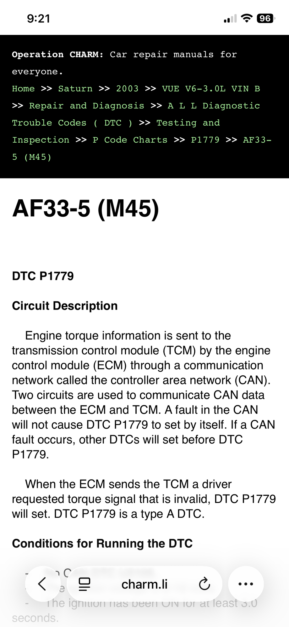2002 Saturn VUE 3.0V6 code p1779