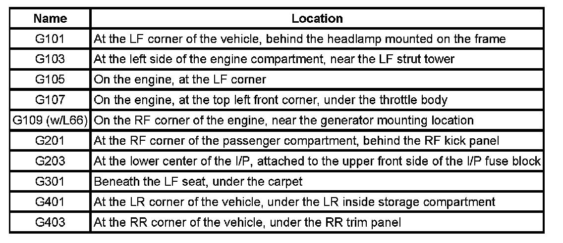 Here's the grounds list. Operation CHARM: Car repair manuals for everyone. Home >> Saturn Truck >> 2004 >> VUE AWD V6-3.5L VIN 4 >> Repair and Diagnosis >> Diagrams >> Grounds >> Master Ground List Master Ground ListG101 - G403:https://charm.li/images/DM13Q313/gm50/1597045438/pro multis · About Operation CHARM |