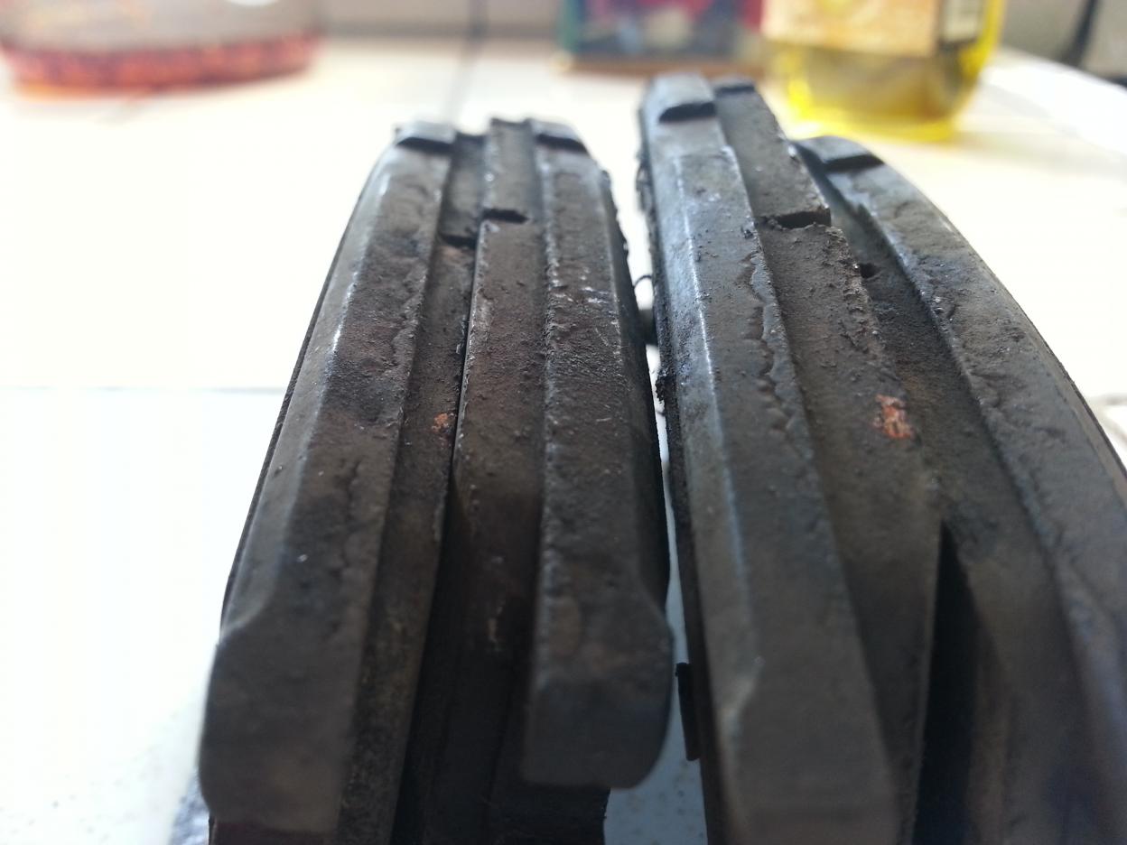Ok. Problem solved. After removing like I said 2 days ago, the Brake hose for inspection, it seemed to have done the trick. So yeah rube, original hose and never been touched. Must have formed some crispy film just enough to cause a leak. But I did the rear brakes yesterday. I did the fronts like 3 months ago. But anyways, here are the pads. Notice the thinner one? That's the culprit. P.s. rear. The caliper pin grease btw, was some what dry. Definitely dry enough to be concerned. So I think my diagnosis of a slight booster hose vacuum leak and some what dry caliper pins was the problem. Wouldyou guys agree? I'll be hanging around here.